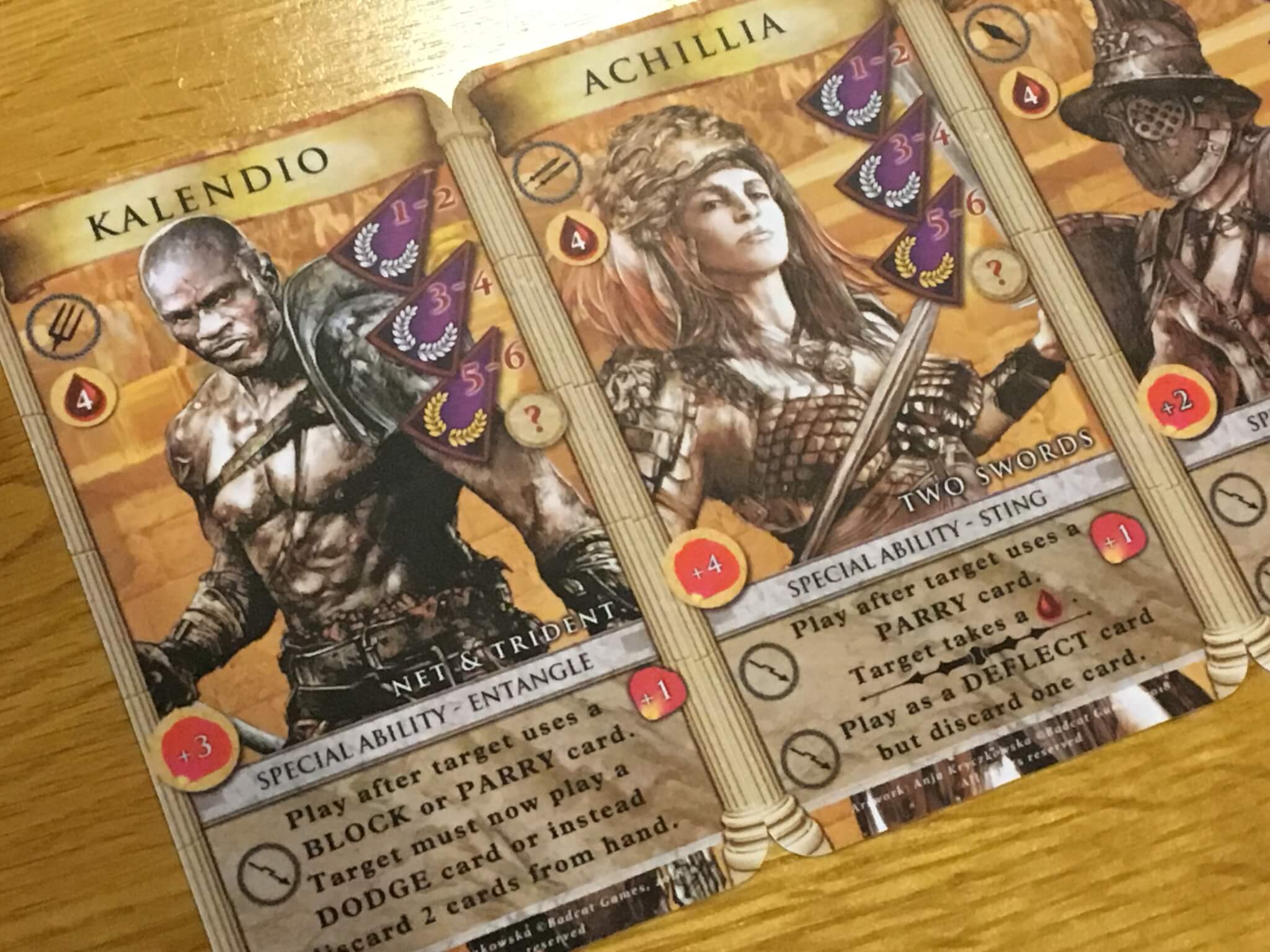 There’s no real way that I have found to mitigate this, although one method that we tried was to have the players sat opposite each other fight each other in turn in the first engagements and then allow combat to follow the normal rules. We also toyed with the idea of allowing later players to draw extra cards, but since the player order is not linked to the order of who is attacked when, that doesn’t fix it either. On balance, it’s not a major problem, but it legitimately can mean that a gladiator in fourth or fifth turn order can be killed long before they have a chance to attack.