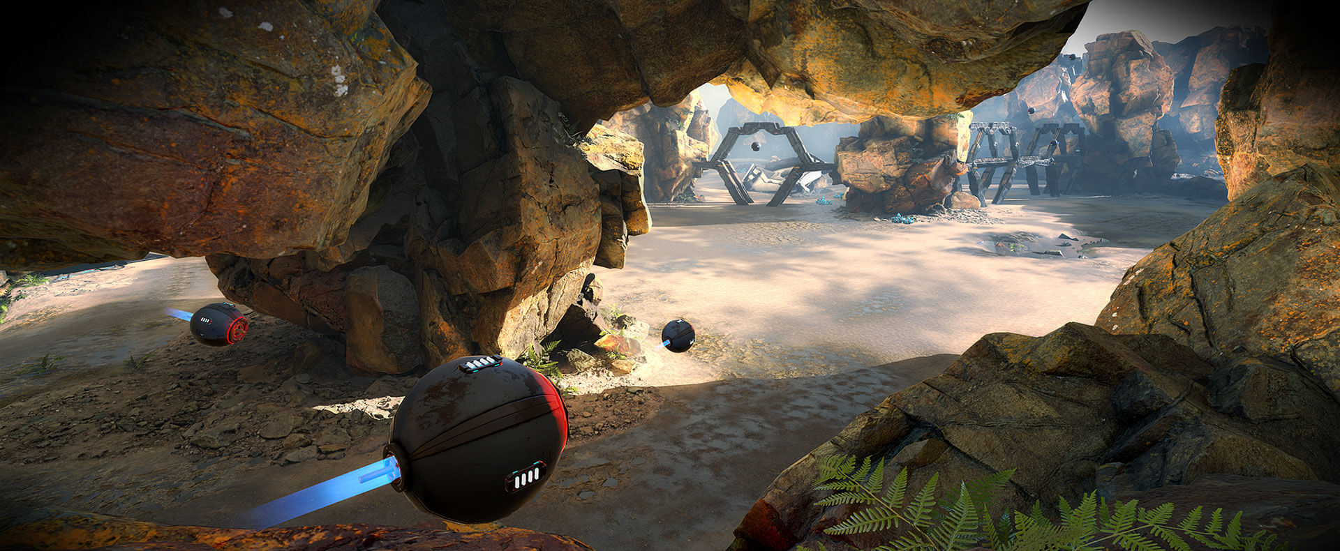 The control scheme felt very natural: whilst I scraped off the paintwork by clumsily bumping into rocks and grating along the sides of cliffs for the first few minutes; I quickly got a feel for the combination of turns, strafe and speed. Pretty soon, I couldn’t hold back the stupid grin which followed my mental narrative of “holy crap I just did a 180 slide through that tiny hole in the rock and then wove through a bunch of obstacles without crashing — THIS FEELS AWESOME”.