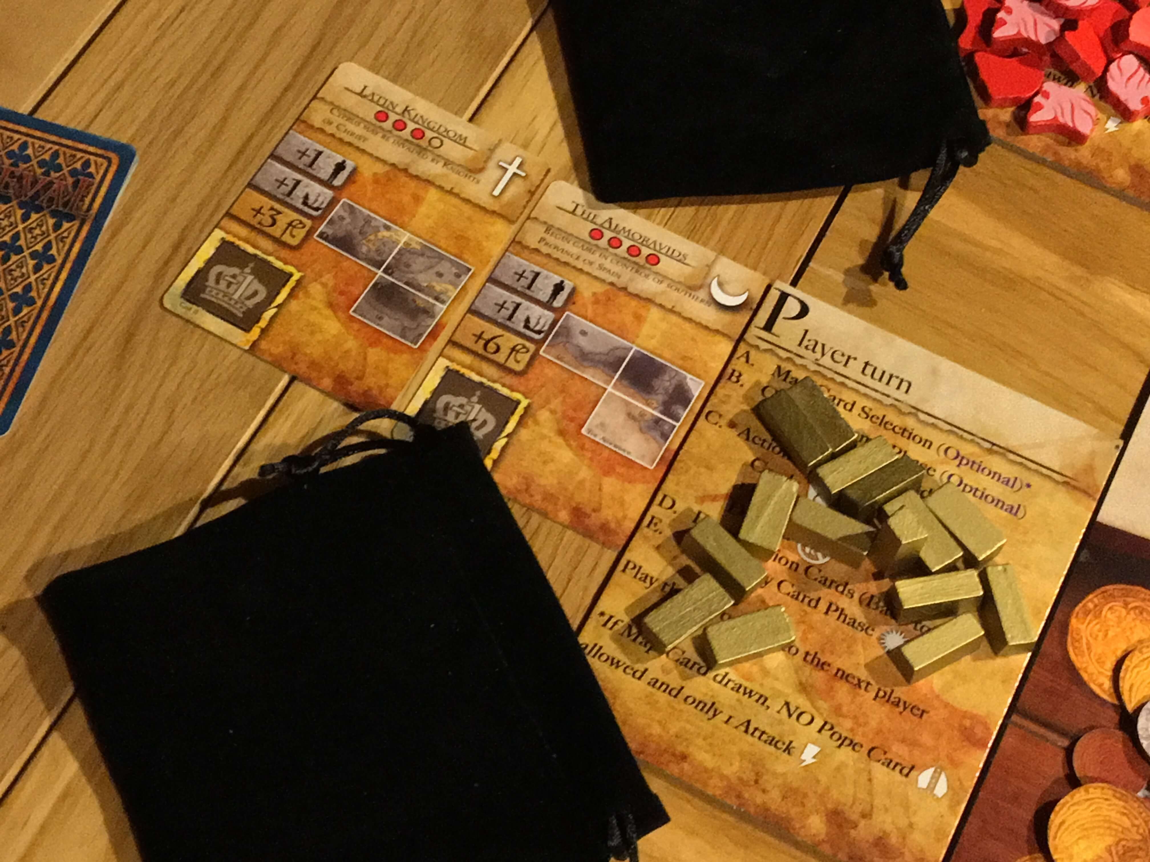The other components that require a mention are the event cards, the players’ aids and the instruction manual. I should mention that I have by no means covered all of the pieces in the box here, either, and Medieval is a very nicely produced game. There are cloth bags to hide your coins in, the coins themselves and double-sided tiles to cover areas of the map — either because they have not been discovered or because the Mongols have razed them to the ground. There are a number of tokens to show statuses like civil war or plague, some wooden ships and a couple of dice, plus a few bits I will almost certainly have forgotten.