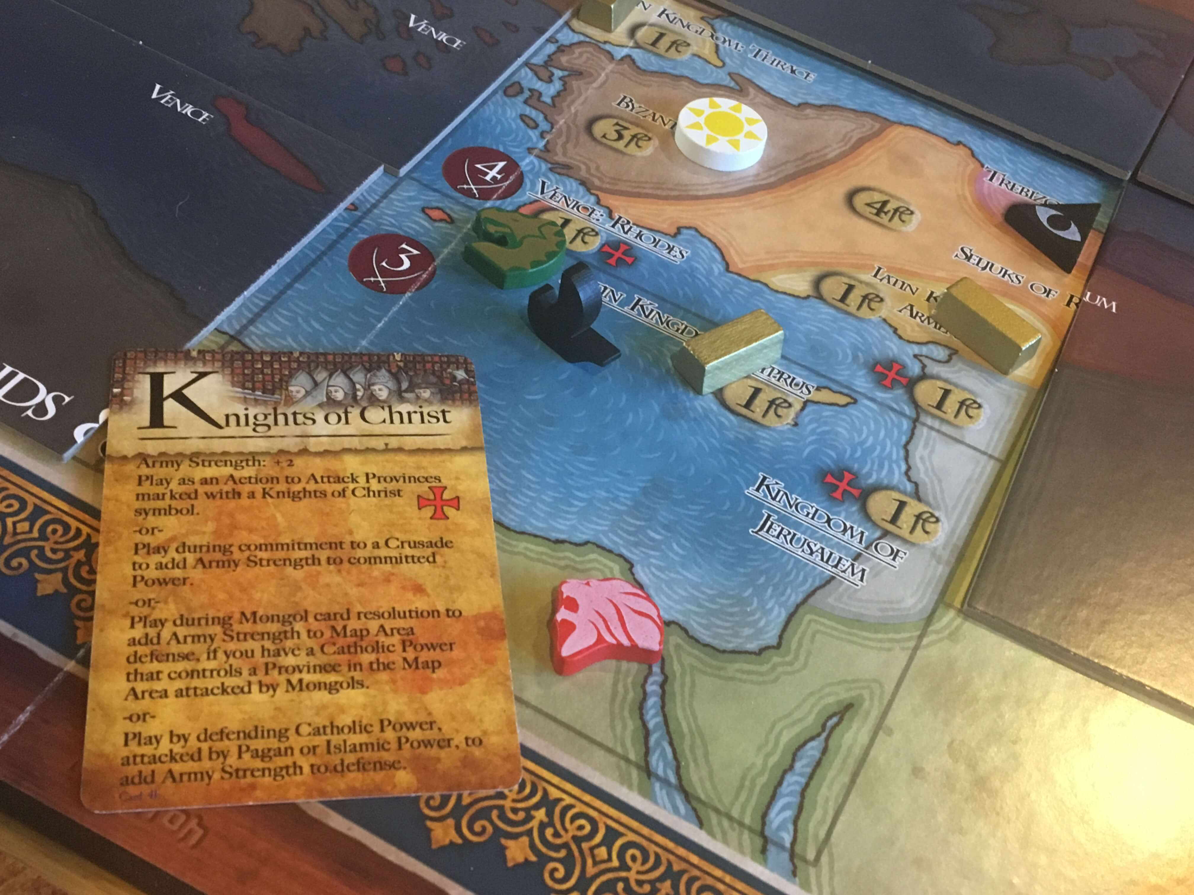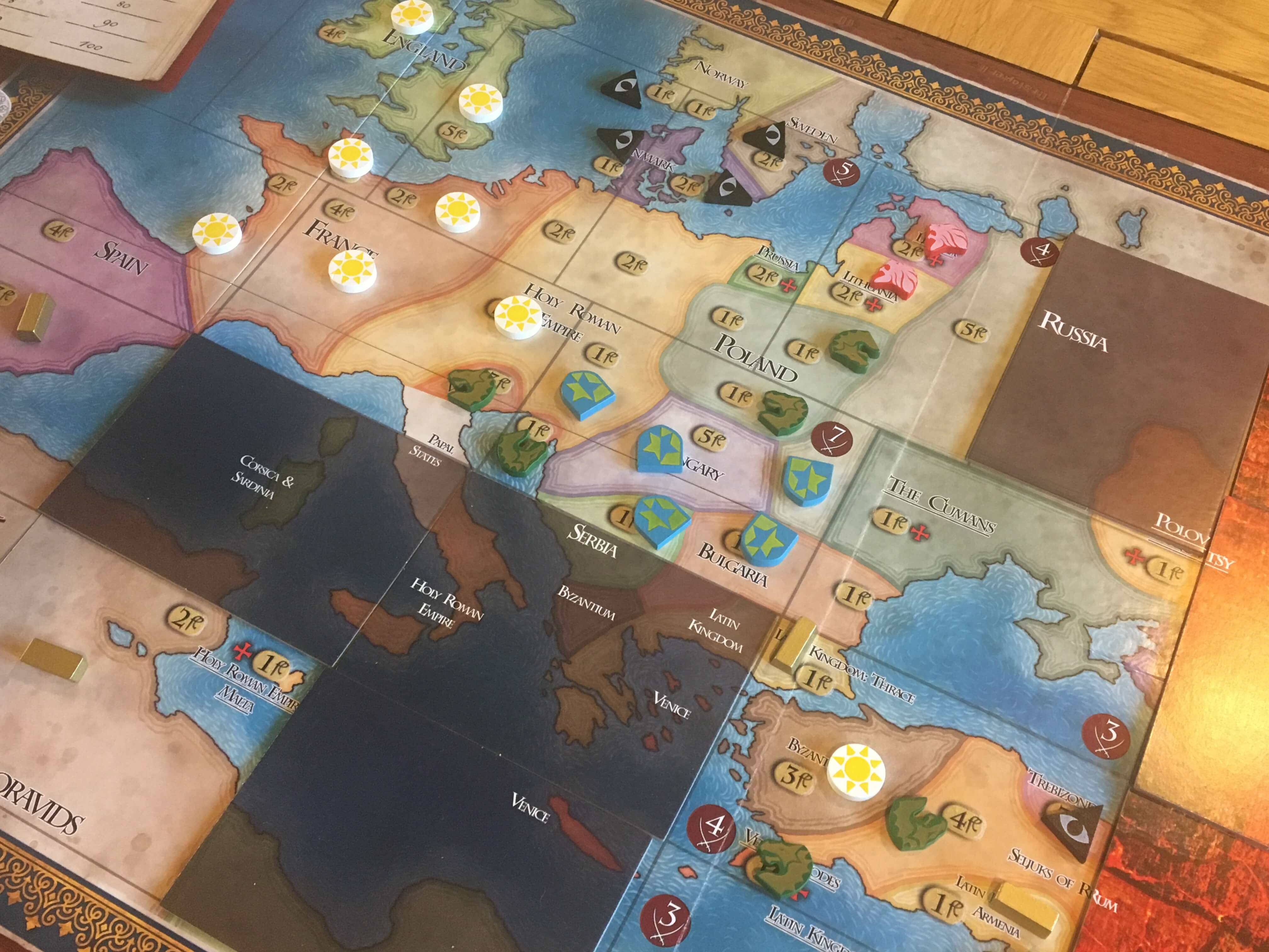 With that said, as someone who is earnestly working their way towards the enjoyment of heavier and heavier board games and in particular, true wargames, Medieval isn’t really heavy at all, relative to what it offers. This is a game that somehow compresses about five hundred years of history into just a few hours. Sure, Medieval glosses over warfare, politics and many of the other ‘realistic’ features that other grand strategy games might feature, but it does dive deeper — just a little — into enough interesting parts of medieval state management for it to maintain a great enough element of excitement.