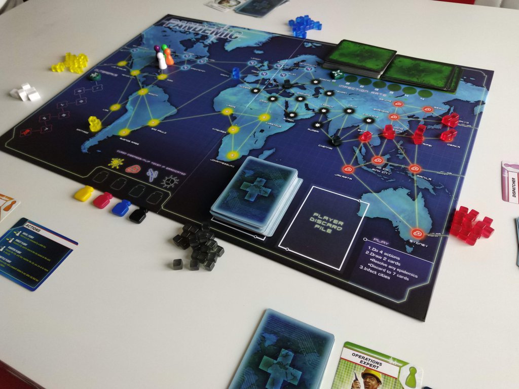In Pandemic, four diseases are threatening to wipe out civilisation — each spreading to its own region. The players have to work together to find cures and rid the world of each one before a pandemic occurs. It has been designed for two to four players who play cooperatively. They each take on one of five roles: dispatcher, medic, scientist, researcher or operations expert.