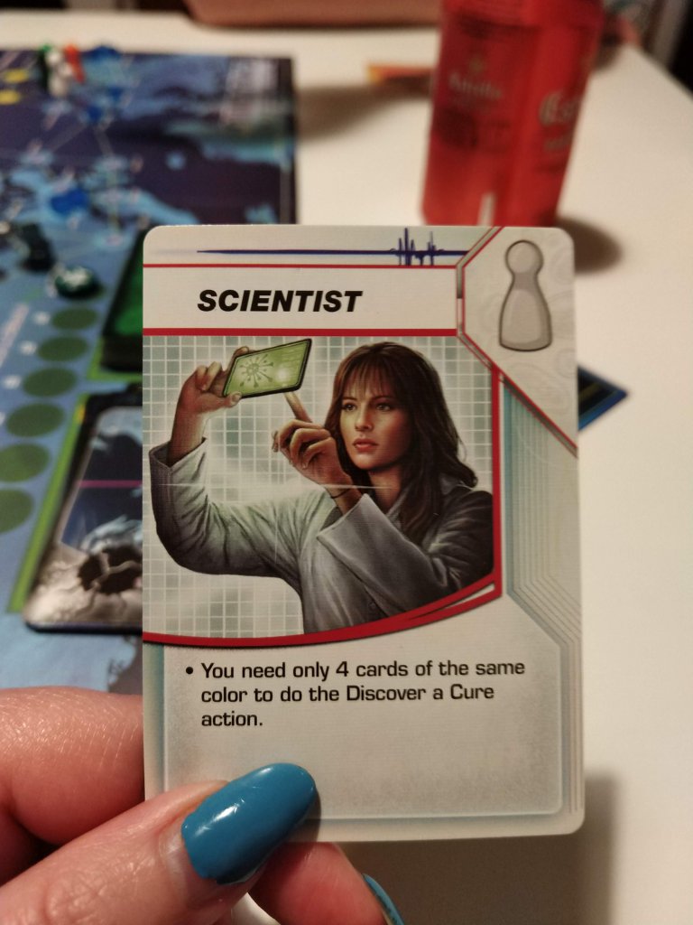At the start of the game, each of the players is randomly given a role to play. Each of these roles have additional perks — for example, the scientist only needs four cards to cure a disease rather than five and the Medic is able to treat all the cubes in a city with one action (or once the cure has been found, without using an action).