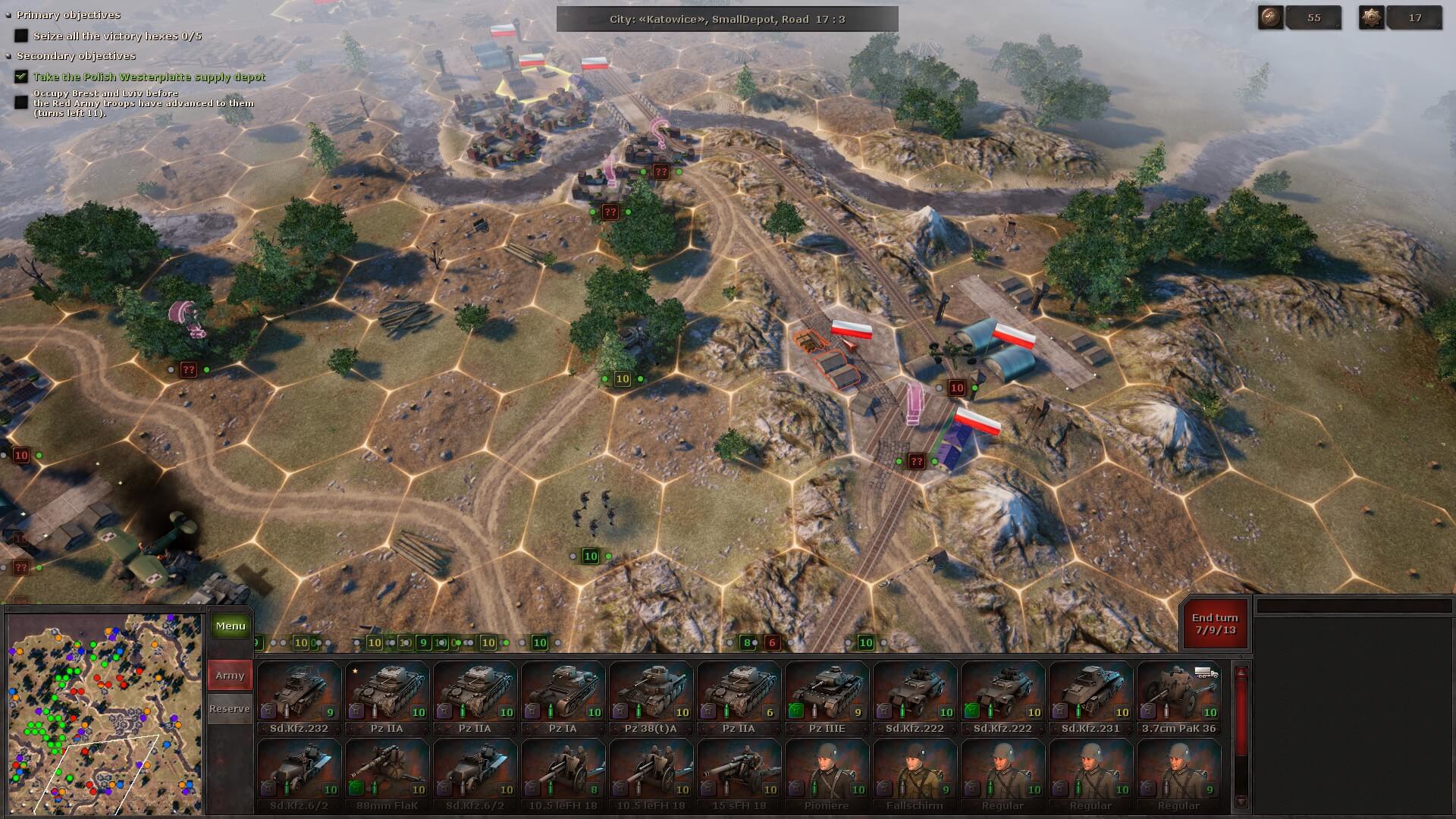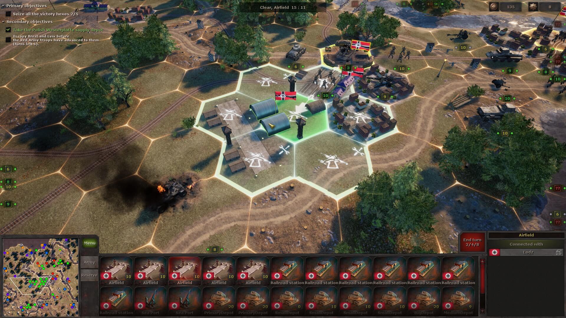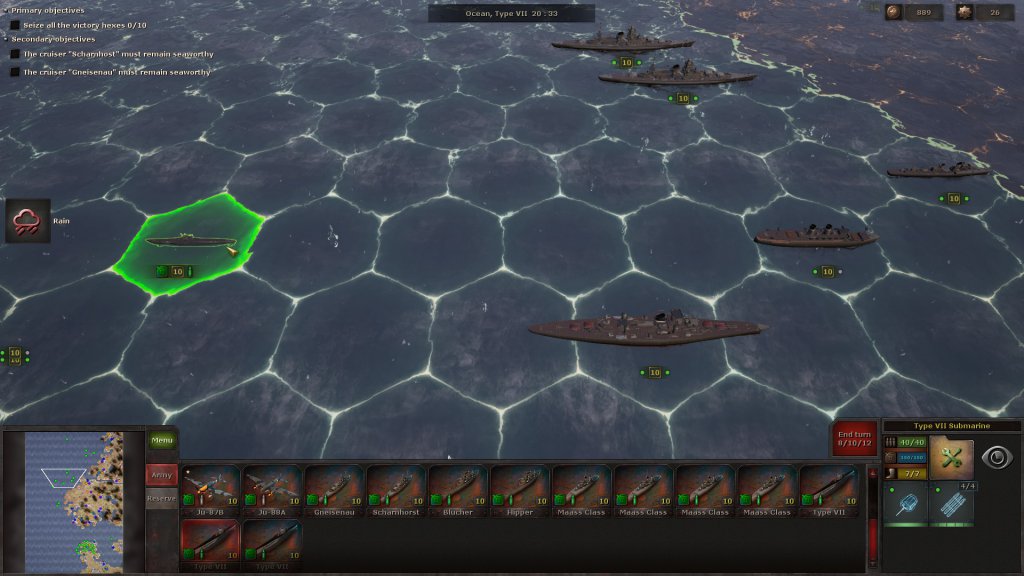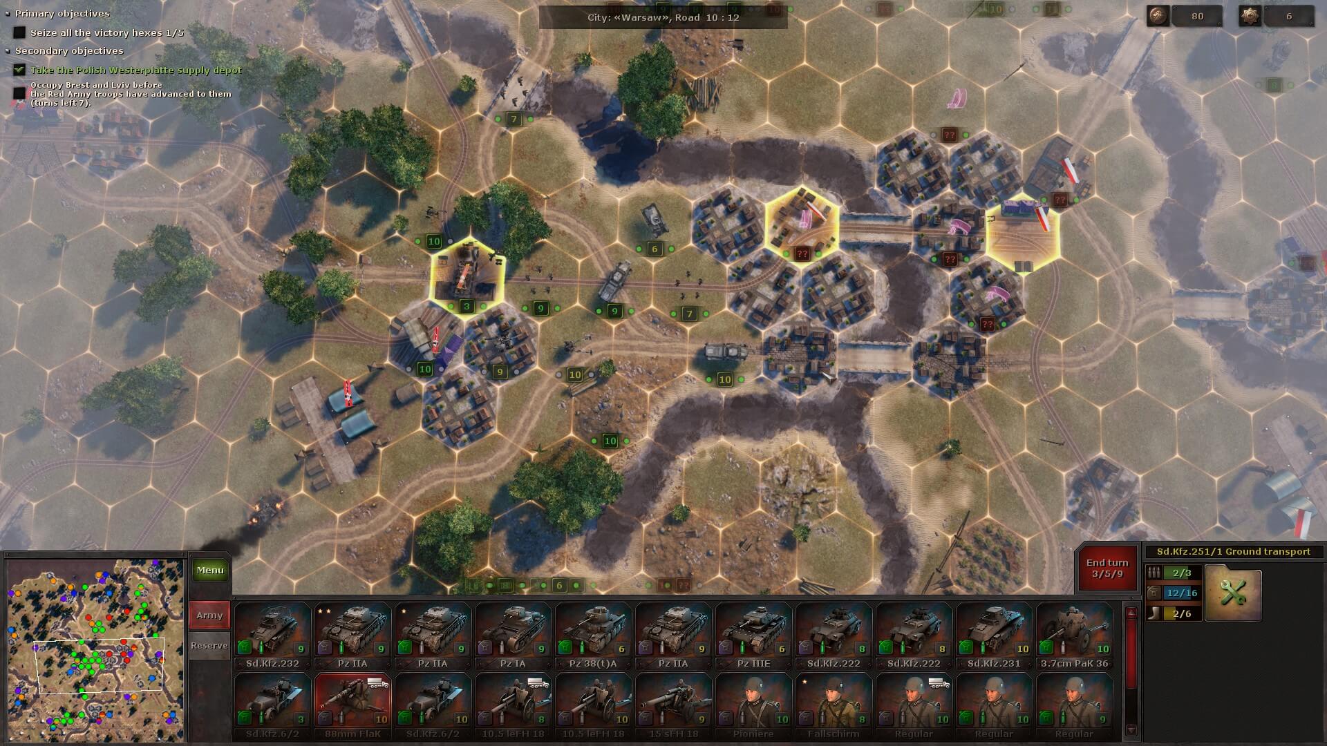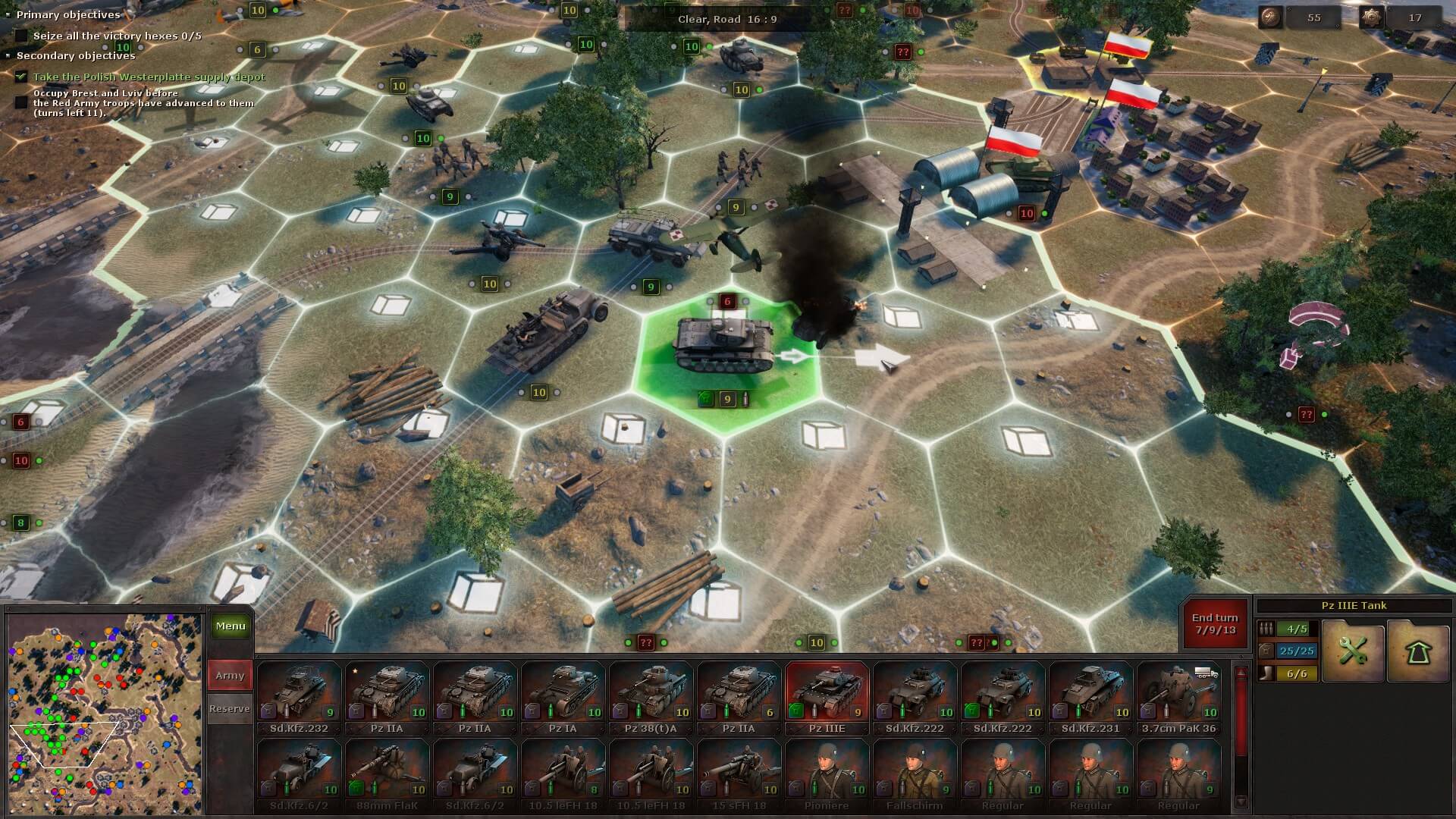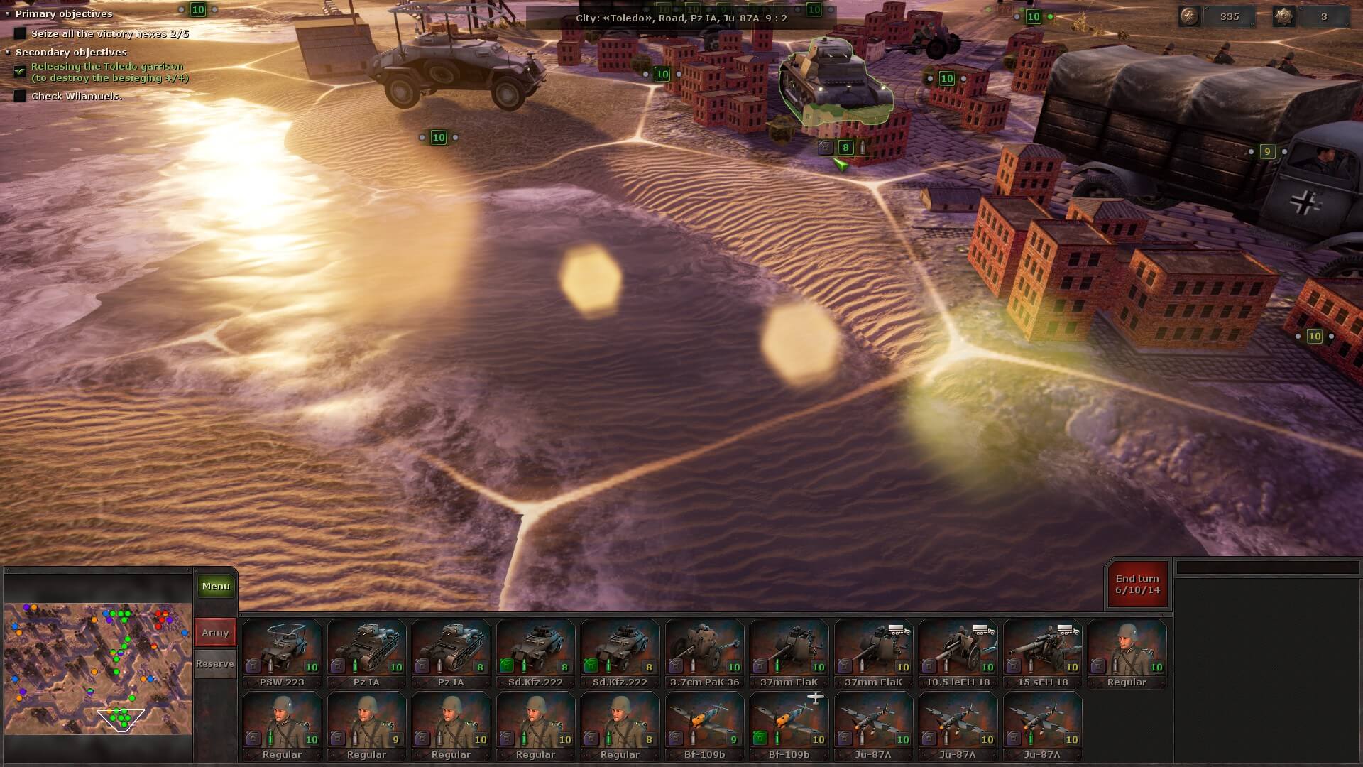 During the next battle, you might receive a few auxiliary units that can’t be moved, but you do have to deploy your own. There’s always a briefing to tell you exactly what you need to do and, sometimes as a secondary objective, in how many turns. Plus, the victory hexes are always highlighted, so you at least know the strategic positions you need to take.