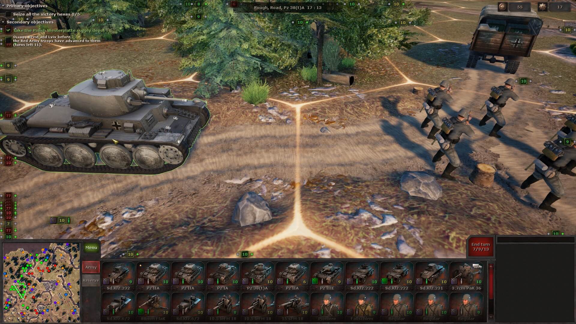 Command Points are generally in short supply and it usually takes five to reinforce a unit. Unlike other games in this genre, this becomes a tightrope balancing act. Sure, you want your Pionieres sitting at six strength to be up to full (ten). Same with your rearward Pz IIA, which is down to four. However, if you start the turn with fifteen Command Points and seven units needing reinforcement, you can’t magically pull that extra twenty points you need out of your Aufklärungspanzers. So, both when and where you add replacements in Panzer Strategy makes for some crucial decision-making problems.