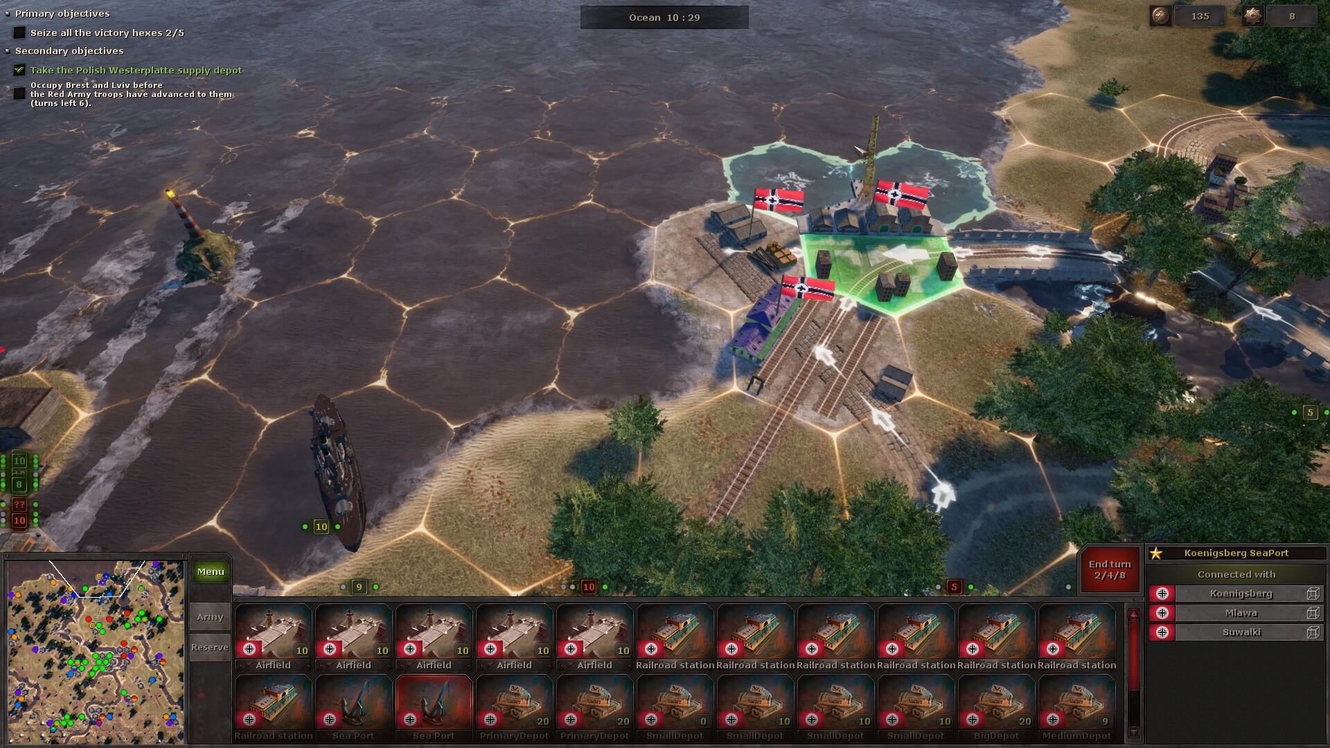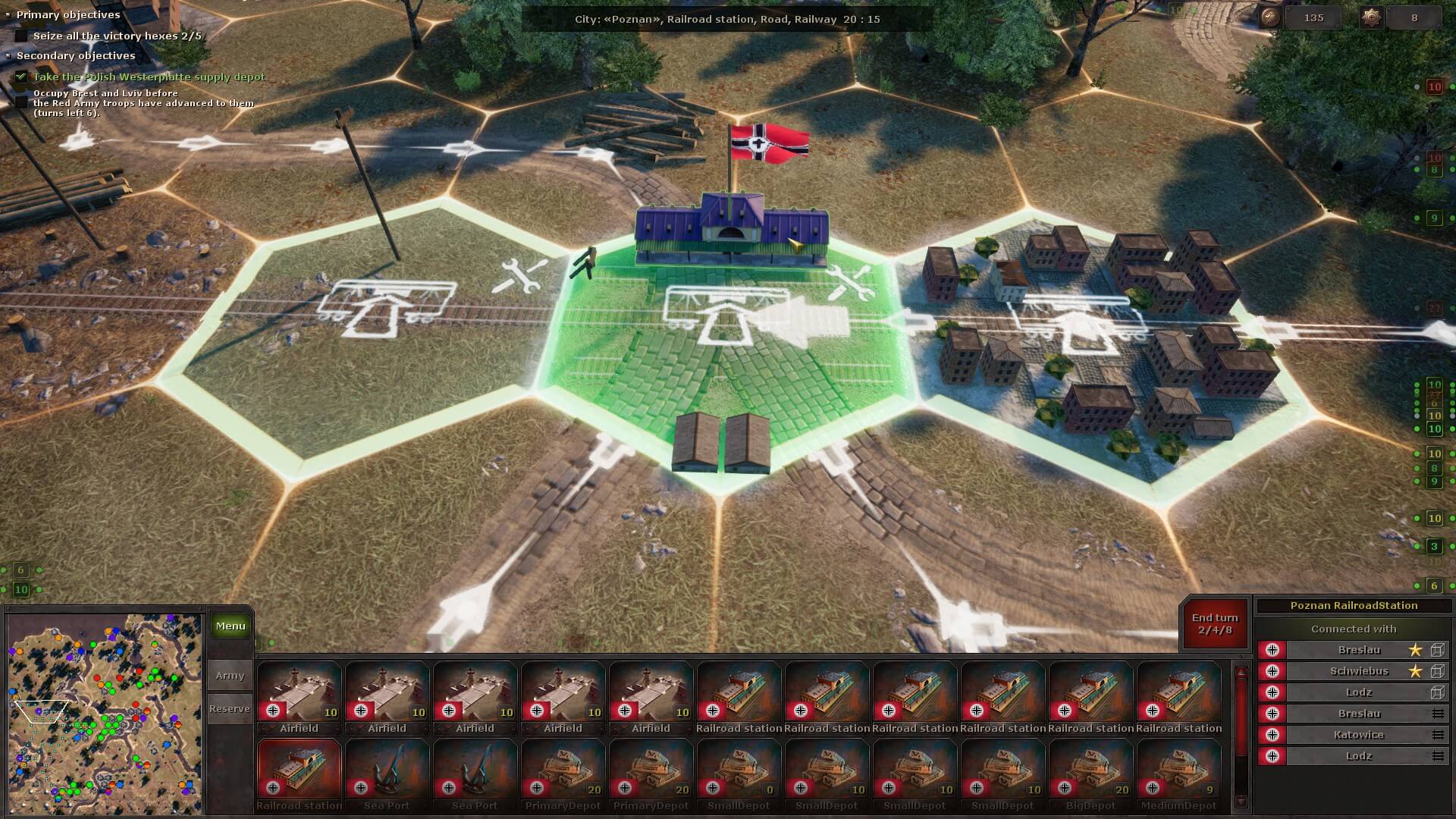 You earn Prestige Points in Panzer Strategy by taking enemy-held positions — and use Prestige Points plus Command Points to reinforce your units. However, unlike the aforementioned games, you can’t simply bring your units up to strength anywhere you choose. Land units have to be within the supply radius of a railroad station (and/or its connections, if you have them). Air units must be resupplied at an airfield, while naval units must use a port.