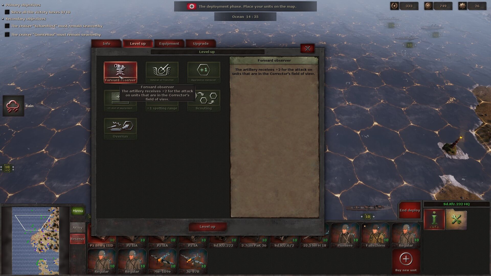 In a way, you are out there on the battlefield. There is always a Command vehicle, which you are in. If you die, it’s game over. You start with a recon-type scout, but can level up between battles if you choose to spend your points in that manner. Sure, you could sit in the rear echelon and just watch the battle unfold. However, that would be a monumental mistake. All units within two hexes of your HQ vehicle receive one extra level! I’m generally on the front, most important line, surrounded by as many units as possible — just to give them that extra level boost. Then, I can still earn extra experience by using the HQ vehicle directly in ‘cleanup’ type roles — like an infantry or armored vehicle down to its last breath/health.