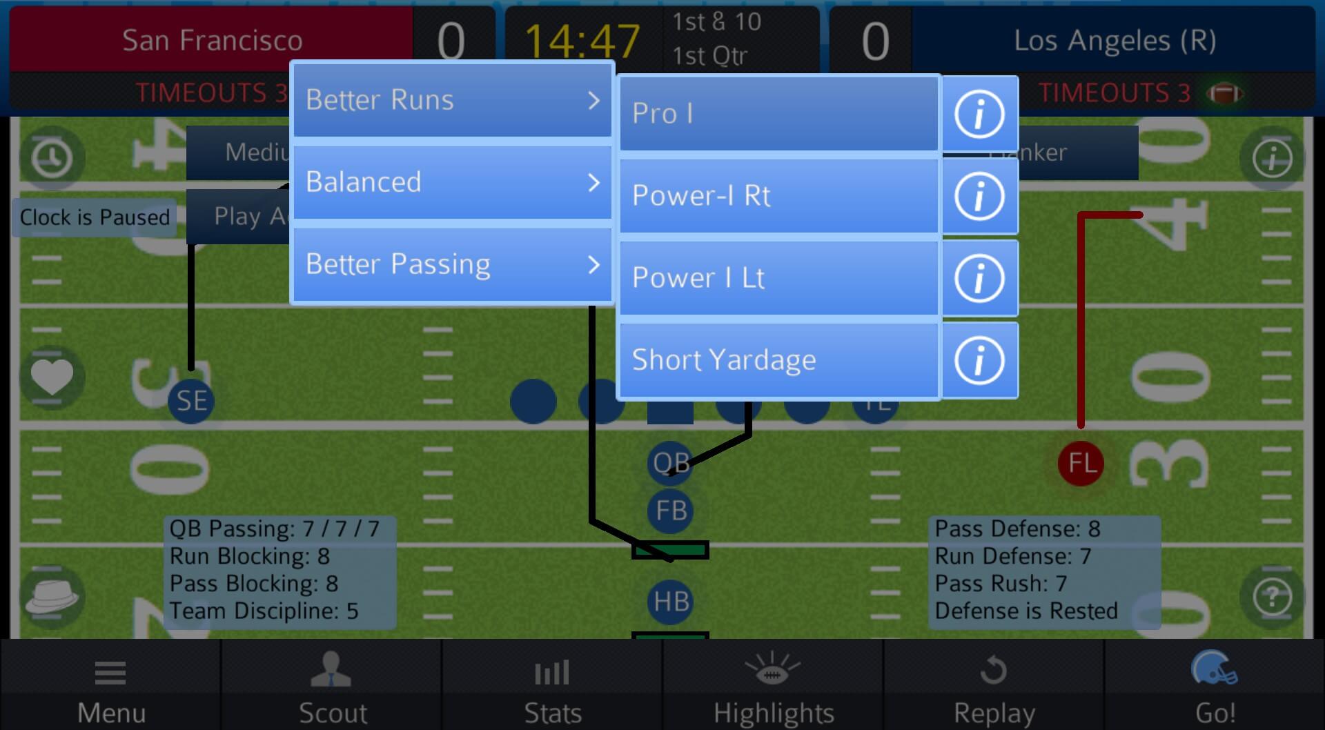 Passing plays, though, are the highlights for me. I can control all of the routes of each power position. I can set up my own plays and keep them. I set who the primary receiver will be. The quarterback will obviously make the best choice once the play is running, regardless of my choice — which is absolutely great because I don’t want him throwing into double-coverage just because I picked the lesser of better options. On Medium passes or longer, I can keep players in to block, rather than sending them all out on routes. Most games don’t have that level of control. This is merely scratching the surface.