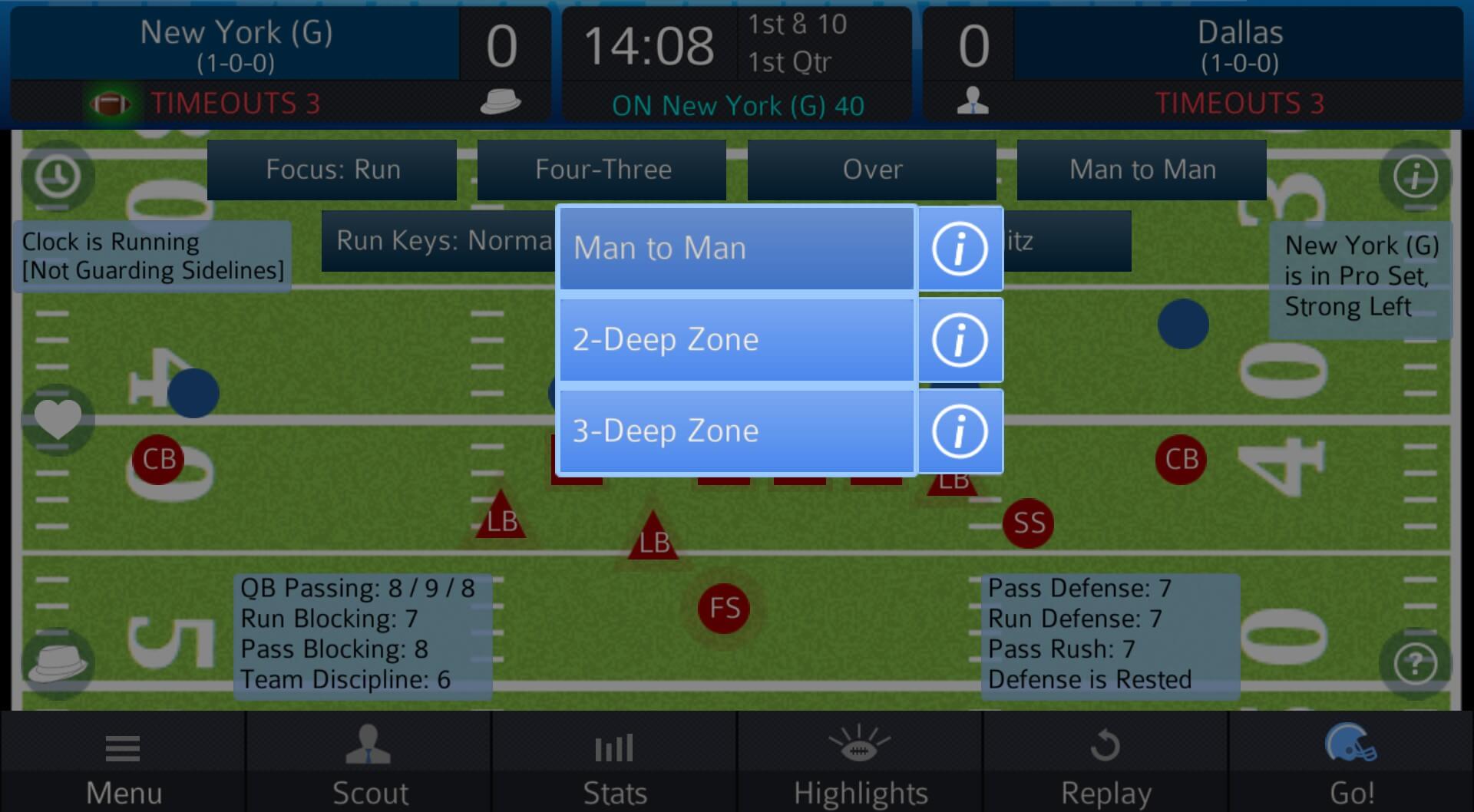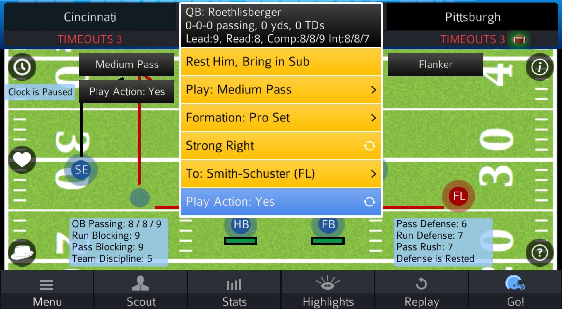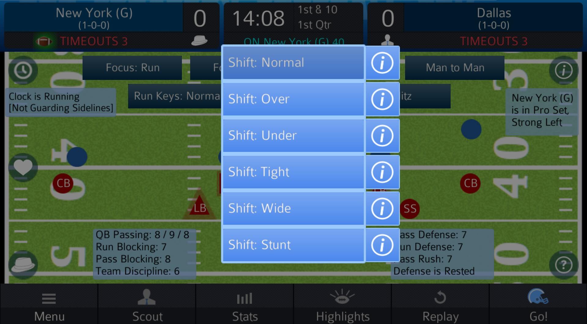 Sure, I played a little at Basic — I might have made it to a quarter of the first quarter. Obviously, my main interest was in Expert. Let’s see what kind of engine it has and, mostly, how flexible the play-calling is. On both offense and defense, the number of tweaks you can make to play-calling is staggering. Simply setting the formation is one tiny part of calling a play. Everything I talk about from here on out is obtained by using Expert level.