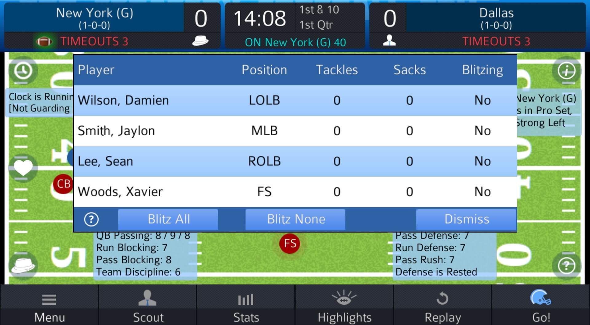 You have a choice of the three basic coverages: Man-to-Man, 2-Deep or 3-Deep Zones. There are seven line shifts, ranging from ‘normal’ to even Stunts — provided you’re not in a 3-4, of course. The defense you choose also dictates how many blitzes you can run on a specific play. You control each non-lineman player individually and whether they blitz or not. There are also buttons to Blitz All or Blitz None. If you’re in a 3-4 watching for a pass and you blitz five, you better hope somebody makes it to the quarterback — or, as in real football, you’ll get burnt to a crisp with a skeleton secondary.