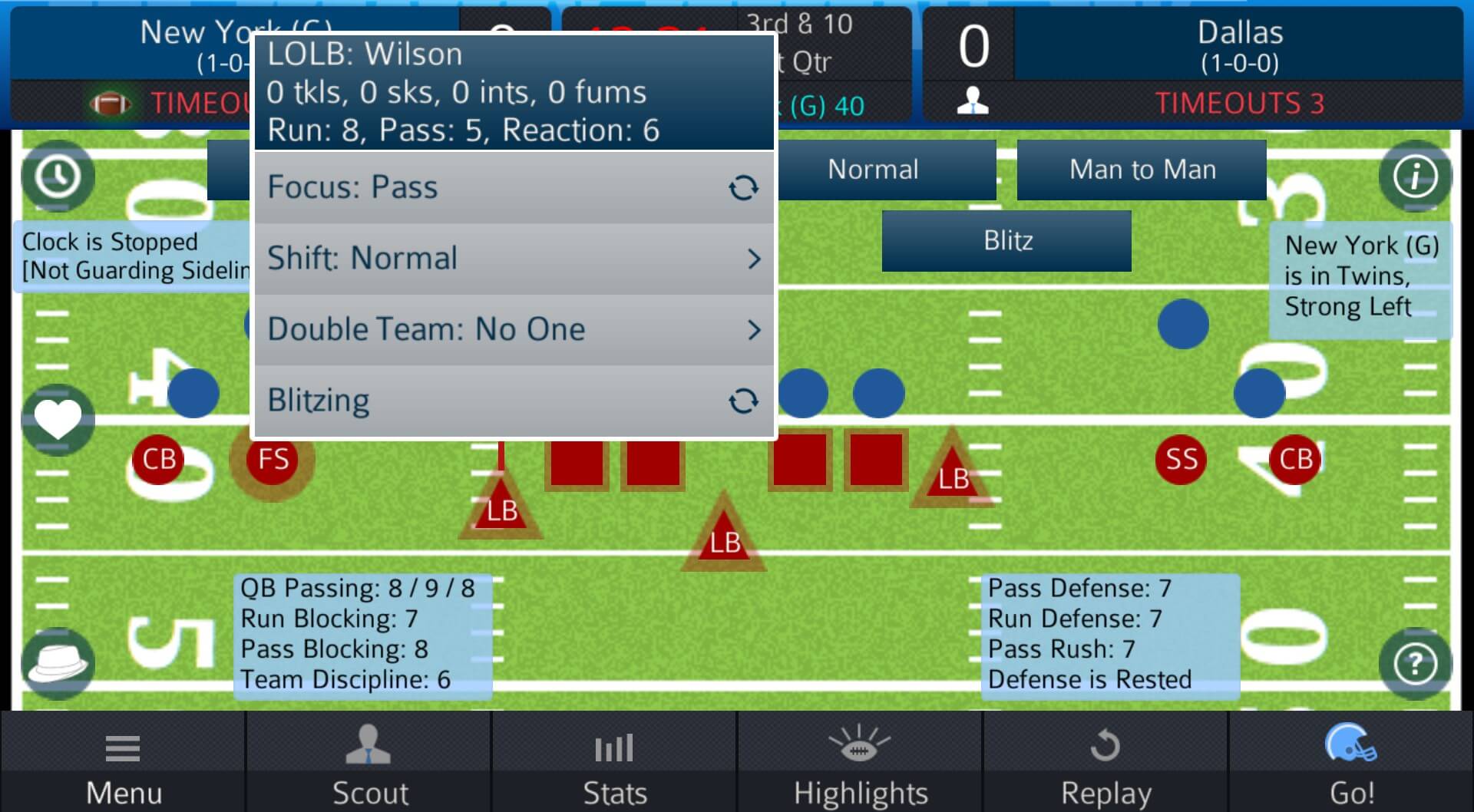 Instead of blitzing, you also have the option to use your backers and secondary to double-team receivers as well. Some plays will automatically do it for you, but you can alter most plays in any manner you choose. So, from the play called, if you’re automatically double-covering the wide-receivers, you can use a linebacker to double a back as well if you choose. When you click a controllable player, a little menu pops up showing all your available options.