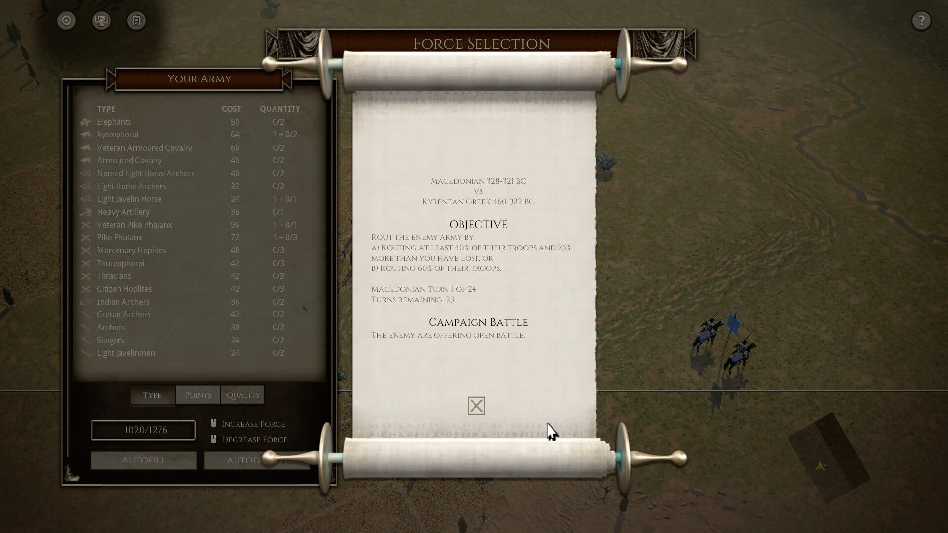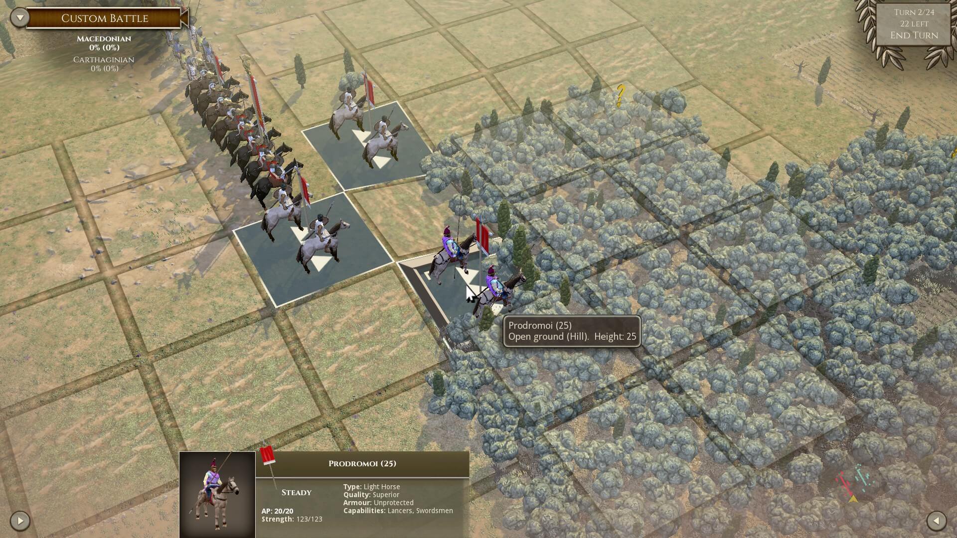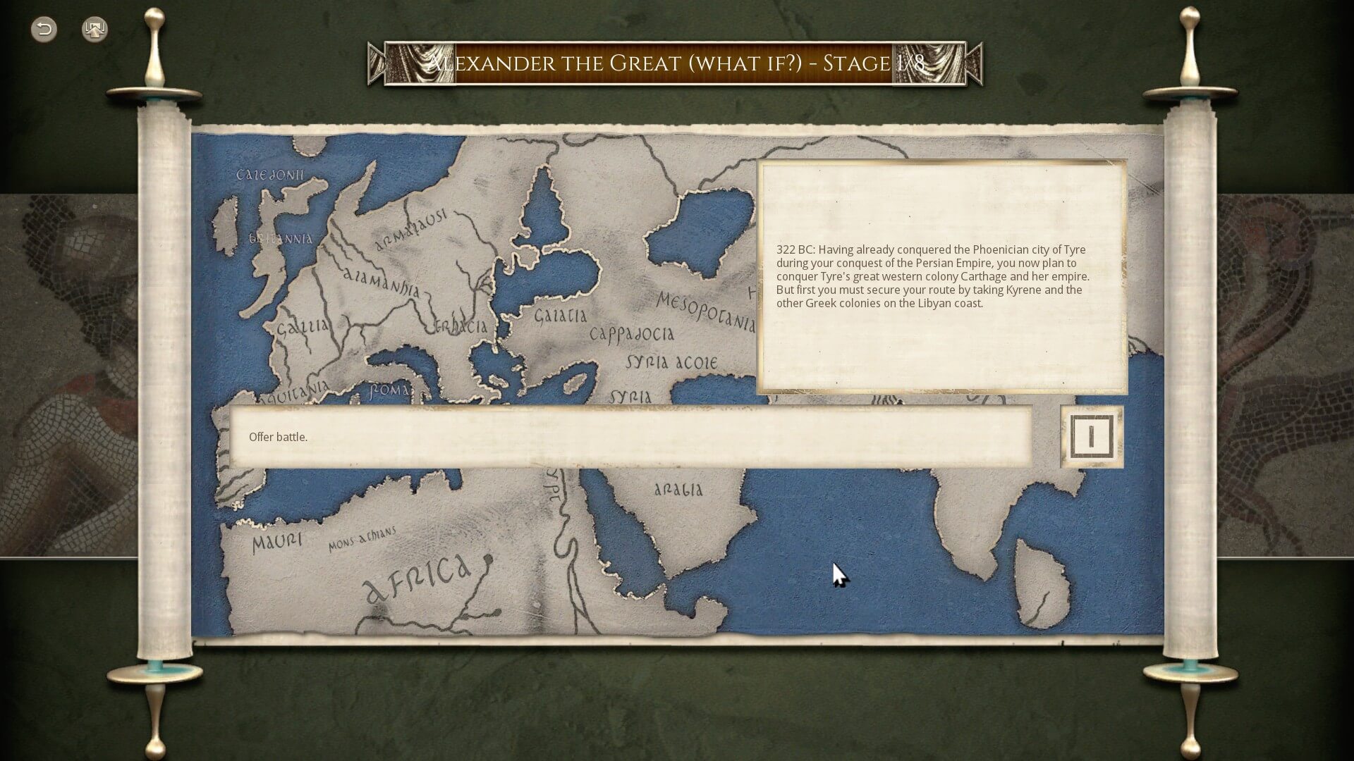 Okay, I had to play both sides of Macedonian (355–329 BC) and Carthaginian (410–341 BC). Also note that I got a very different map the second time around, as the Carthaginians.