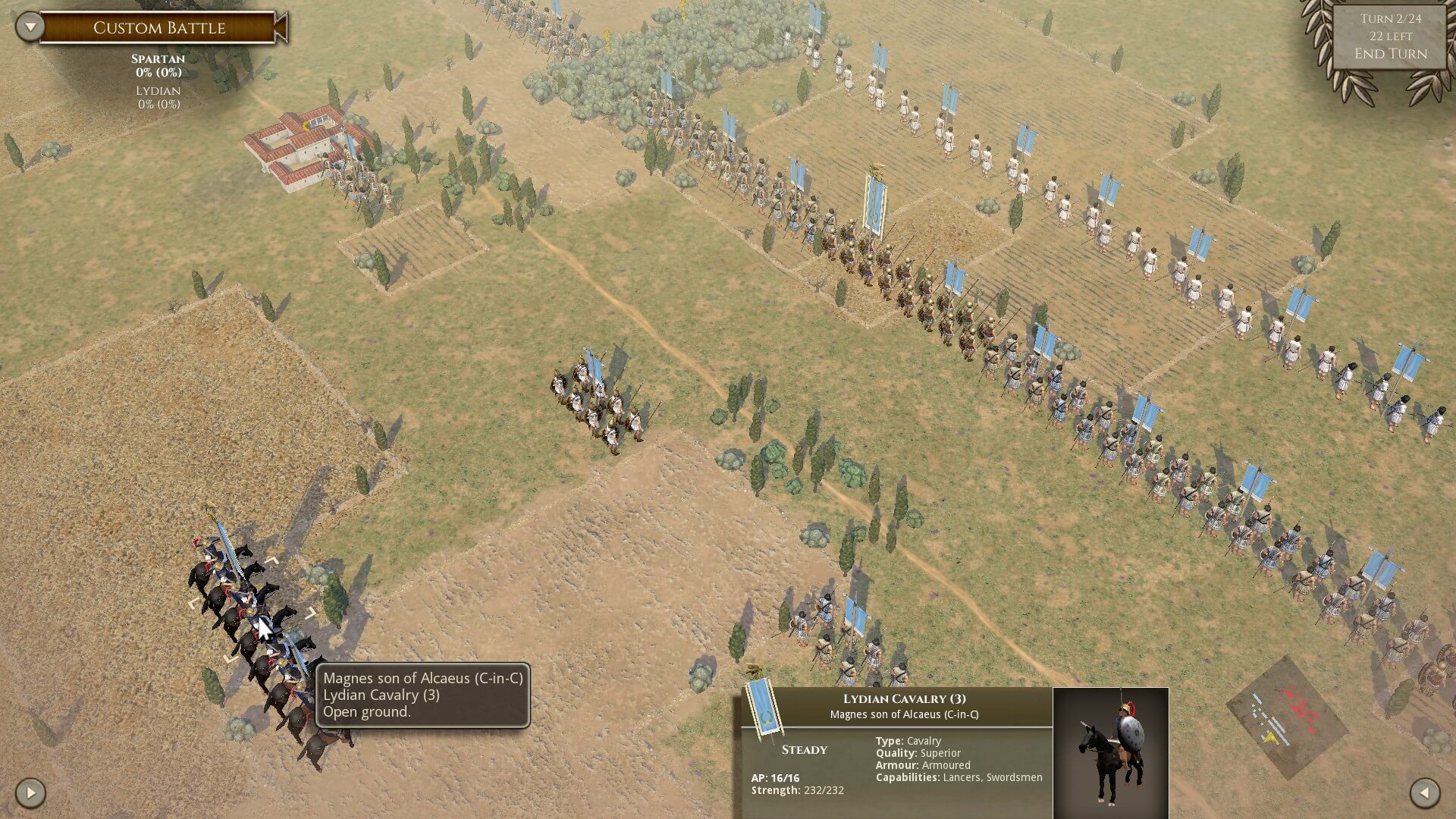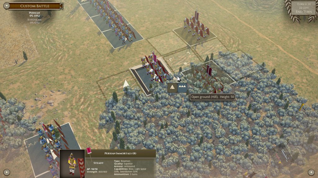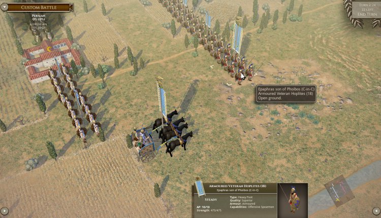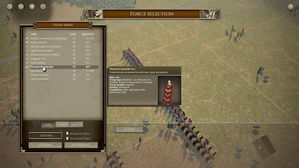 The Persian Immortals aren’t the only new units either. There are nine others as well, including armored citizen hoplites; armored veteran hoplites (with a Spartan variant!); shallow-formed, armored citizen hoplites; Carthaginian chariots; Lydian cavalry; Macedonian prodromoi; Persian armored cavalry with bow; Persian improvised camelry; and Persian sparabara foot.