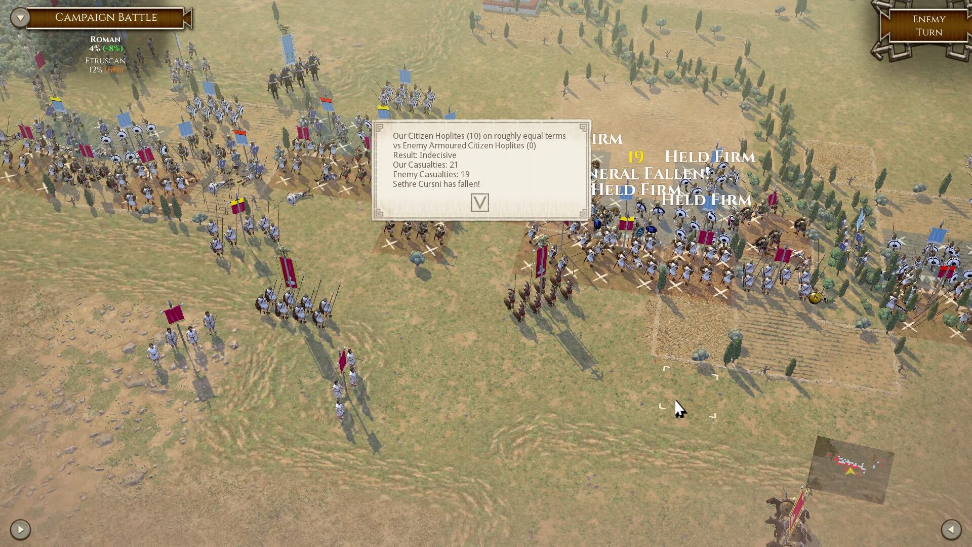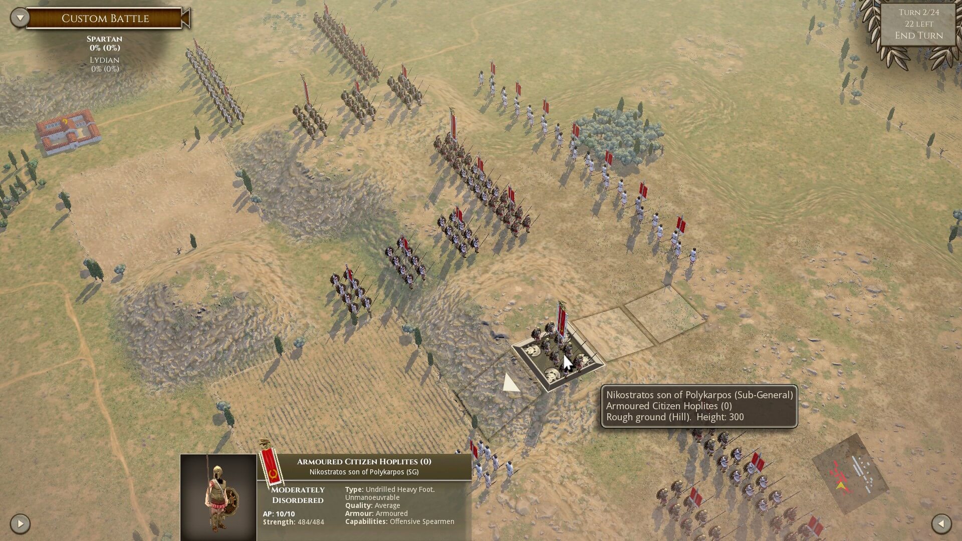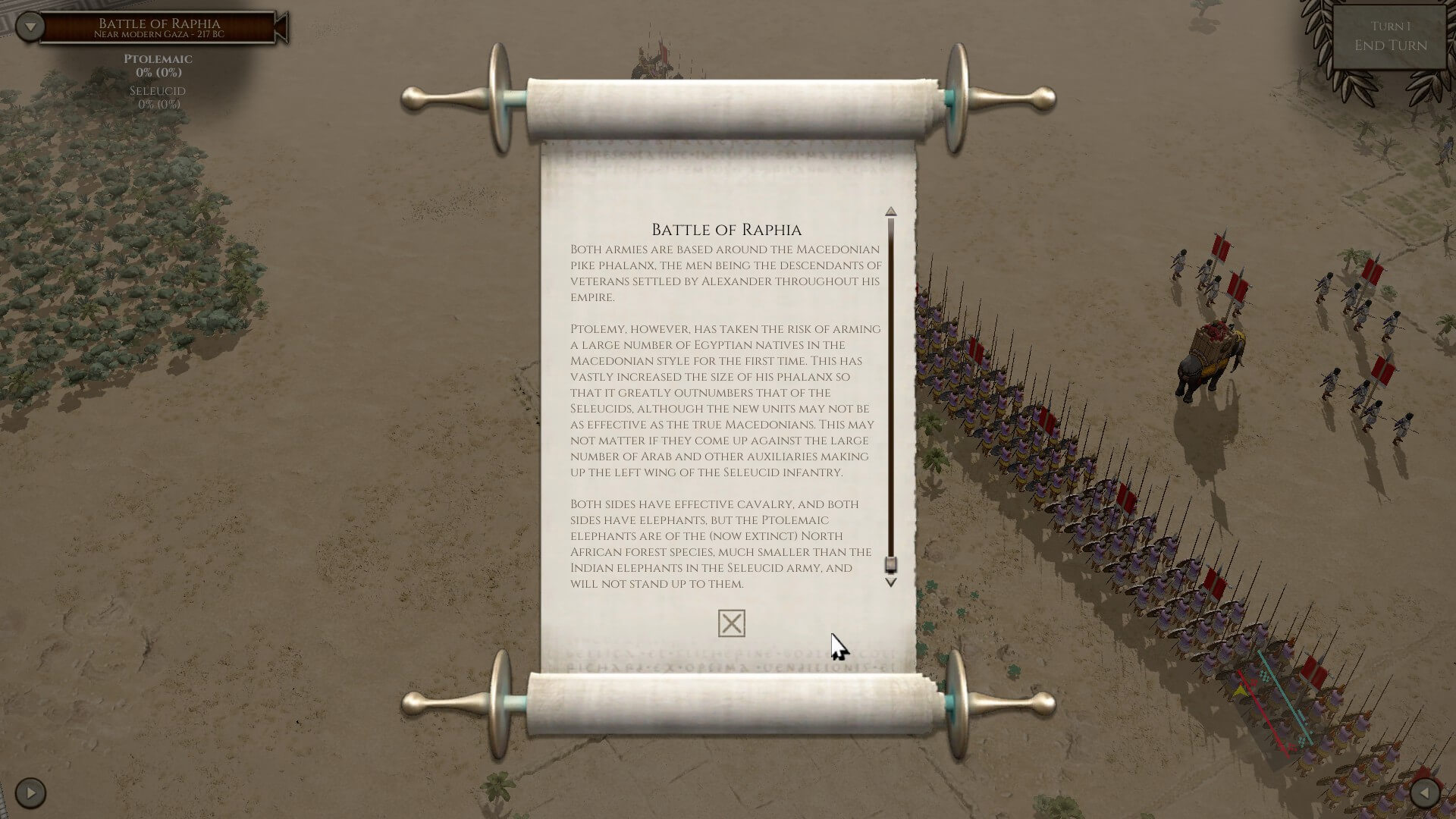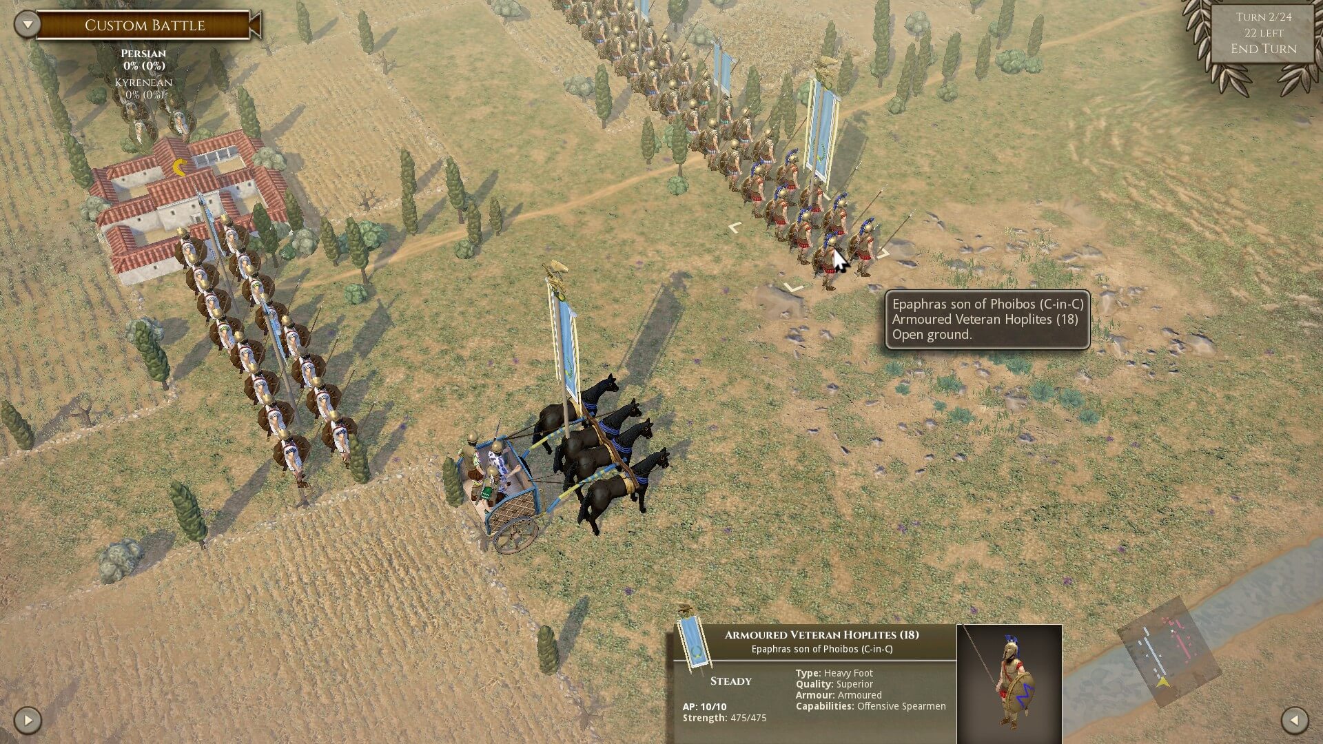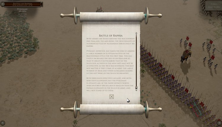 Field of Glory II: Immortal Fire has added twenty-four Quick Battles as well as ten new Epic Battles (more to my tastes), which are: Chaironeia 338 BC, Cunaxa 401 BC, Gaugamela 331 BC, Granikos 334 BC, Hydaspes 326 BC, Issos 333 BC, Marathon 490 BC, Plataea 479 BC, Raphia 217 BC and Thymbra 547 BC.