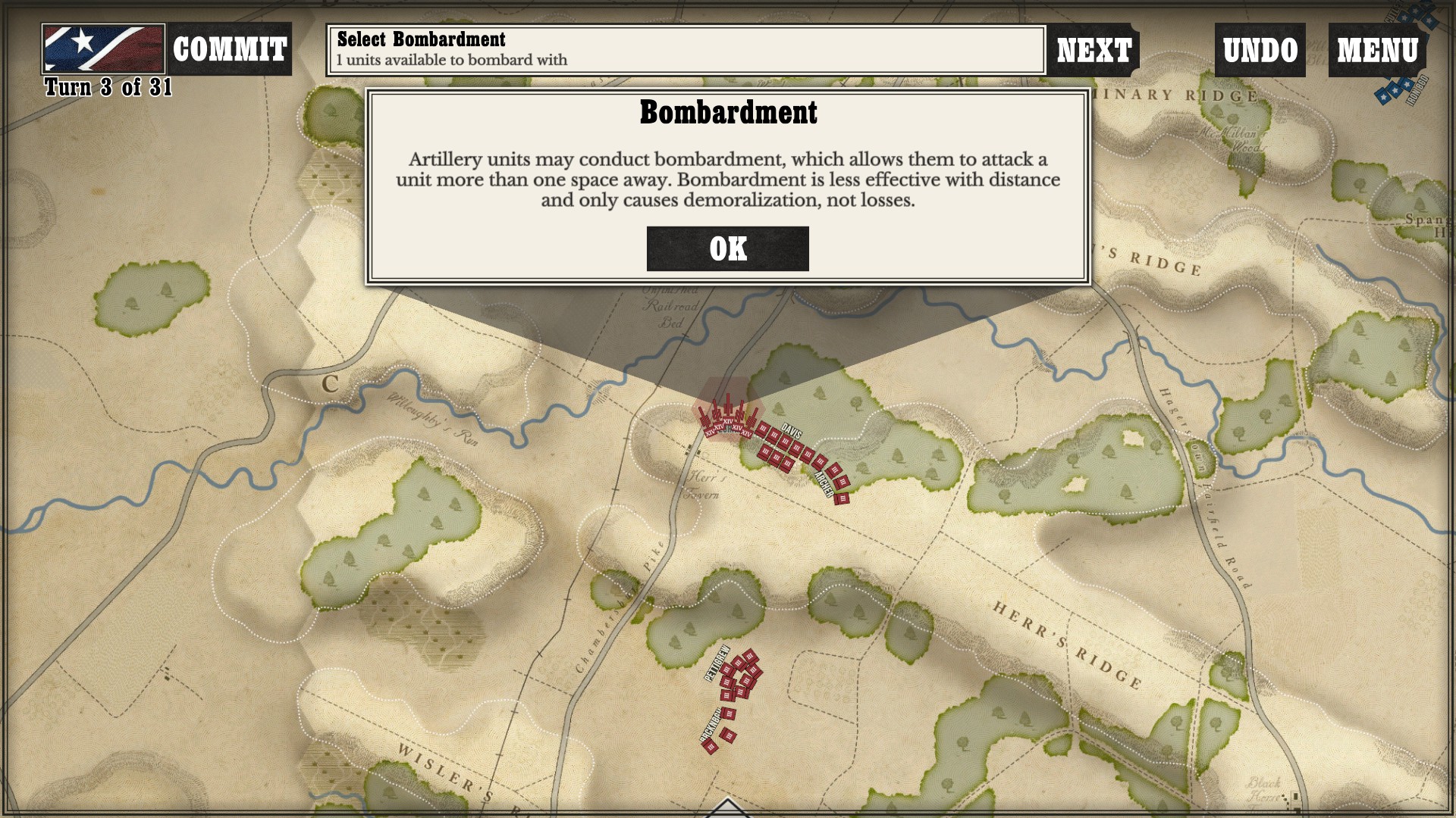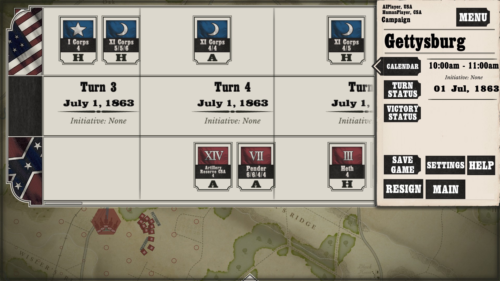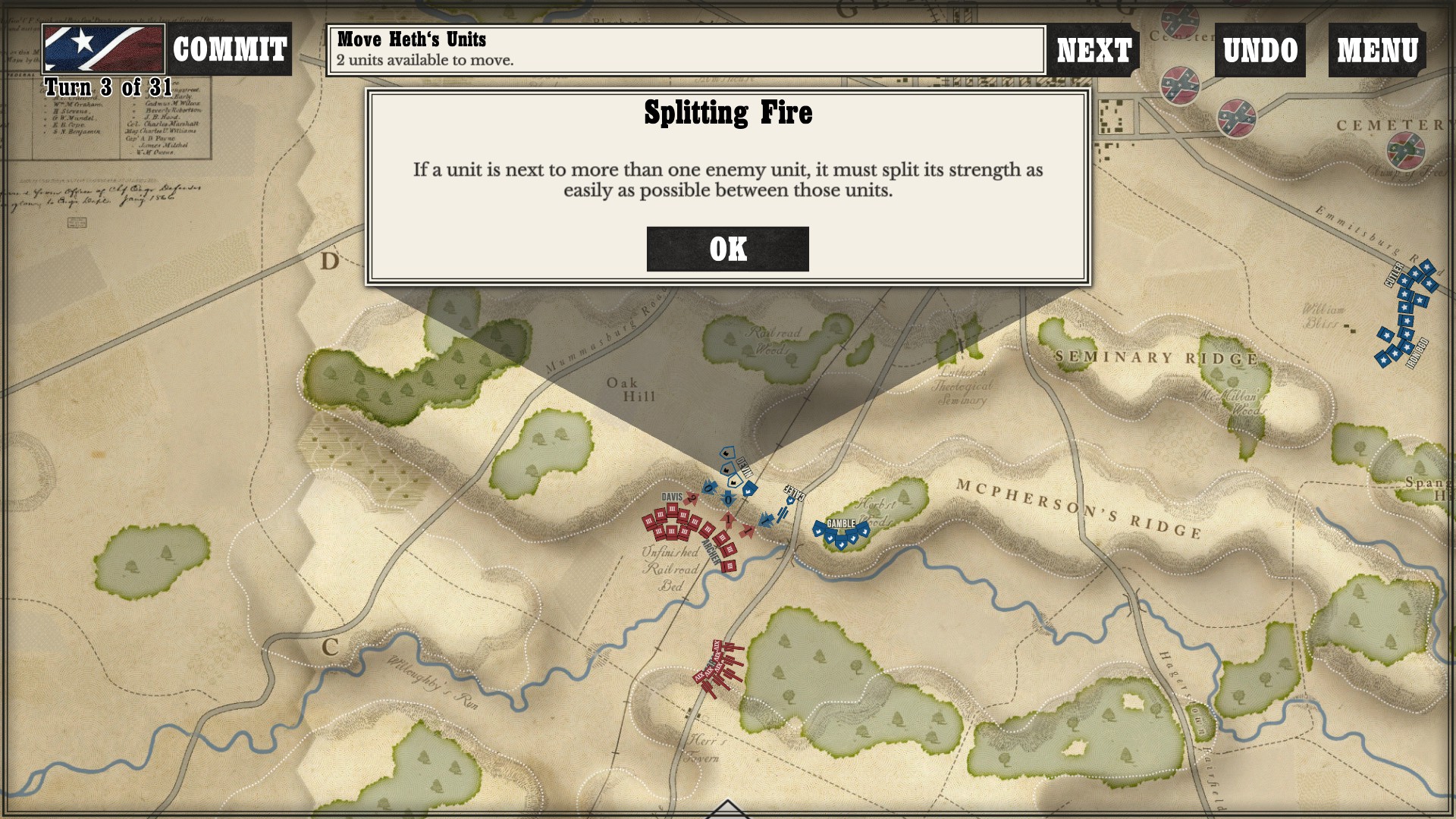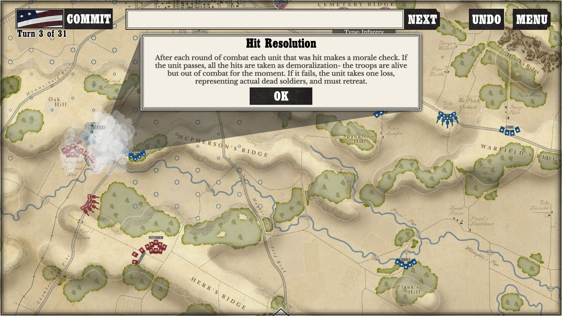 Gettysburg: the Tide Turns is easily a jump-in-and-play type of game. Every time I run across any kind of new game mechanic or information, a screen pops up to tell me what is going on. After I played my first campaign about halfway through as the South, I started a new one as the North to see if I would still get the same information screens. Three turns in, the only new information I got was about my horse artillery, which was new to me as I had not seen it while playing as the South (as far as I went in anyway).