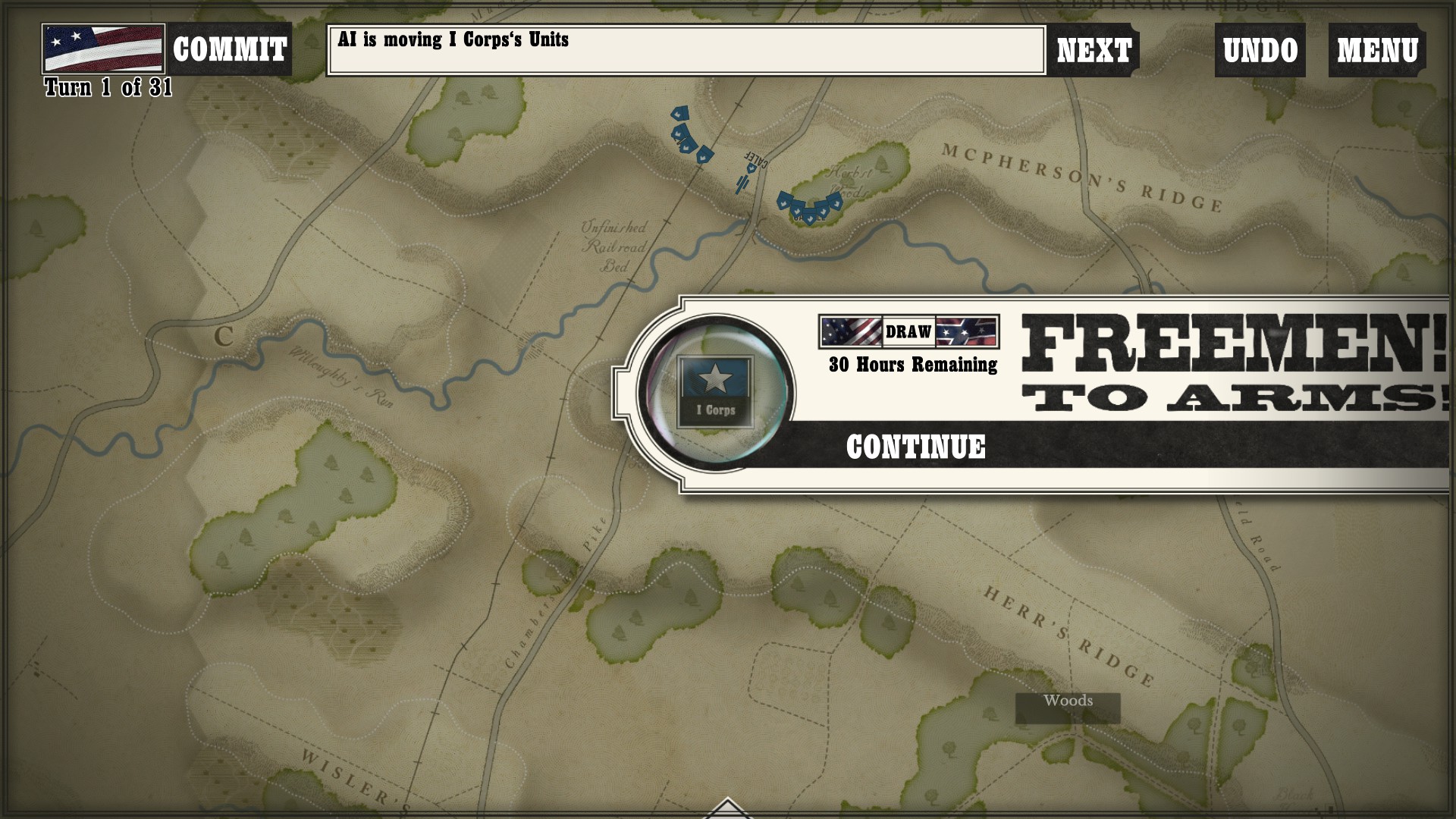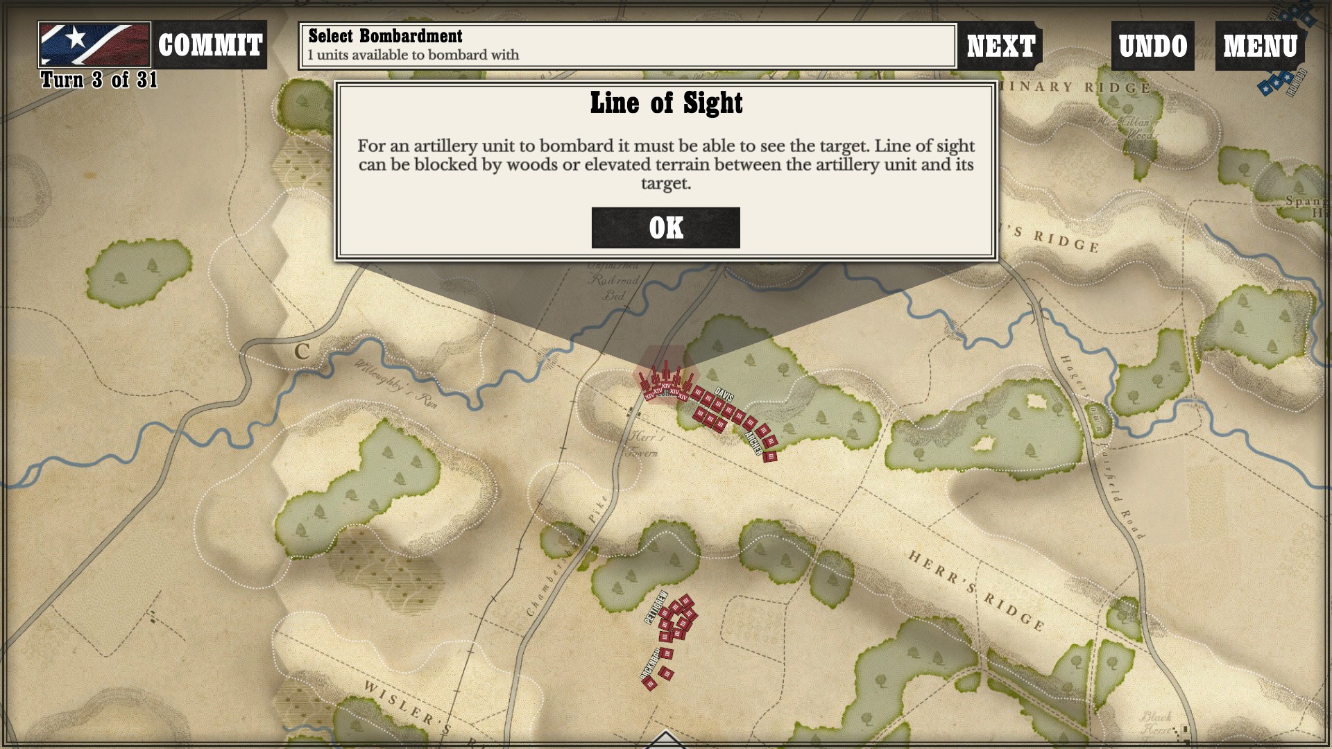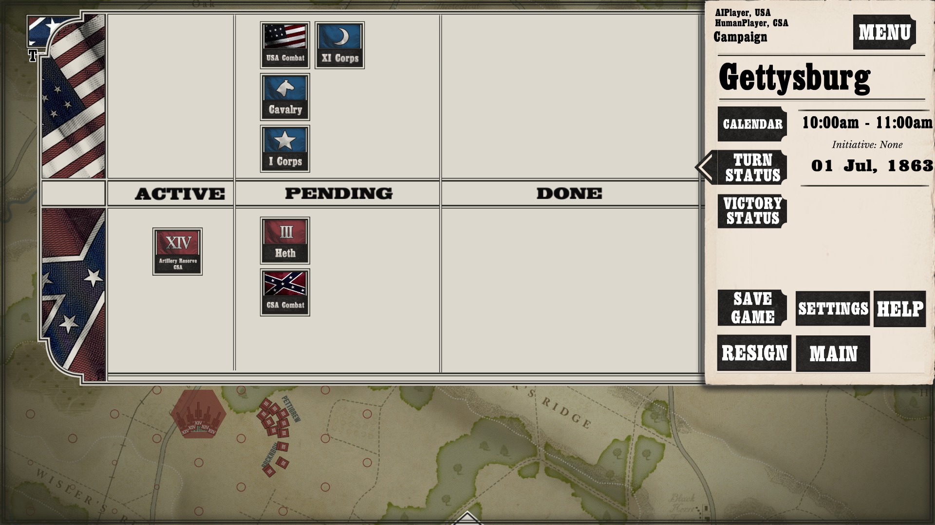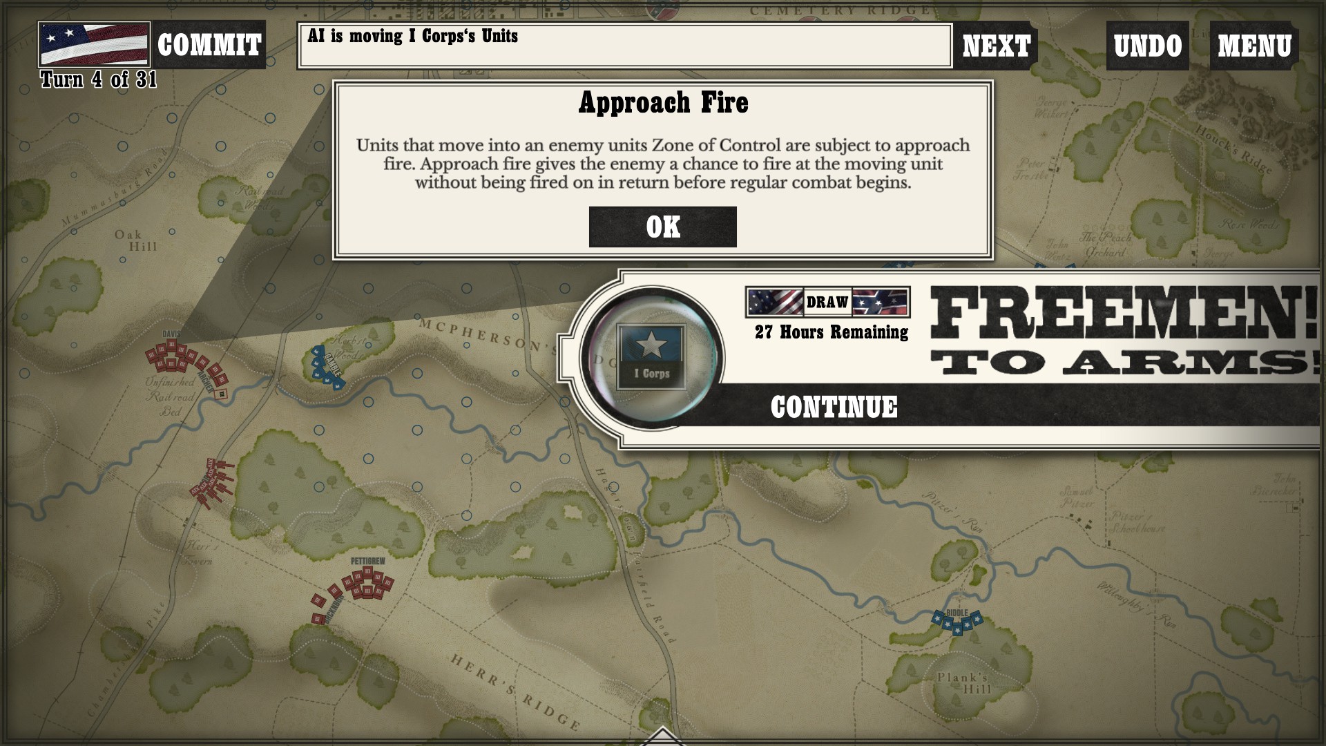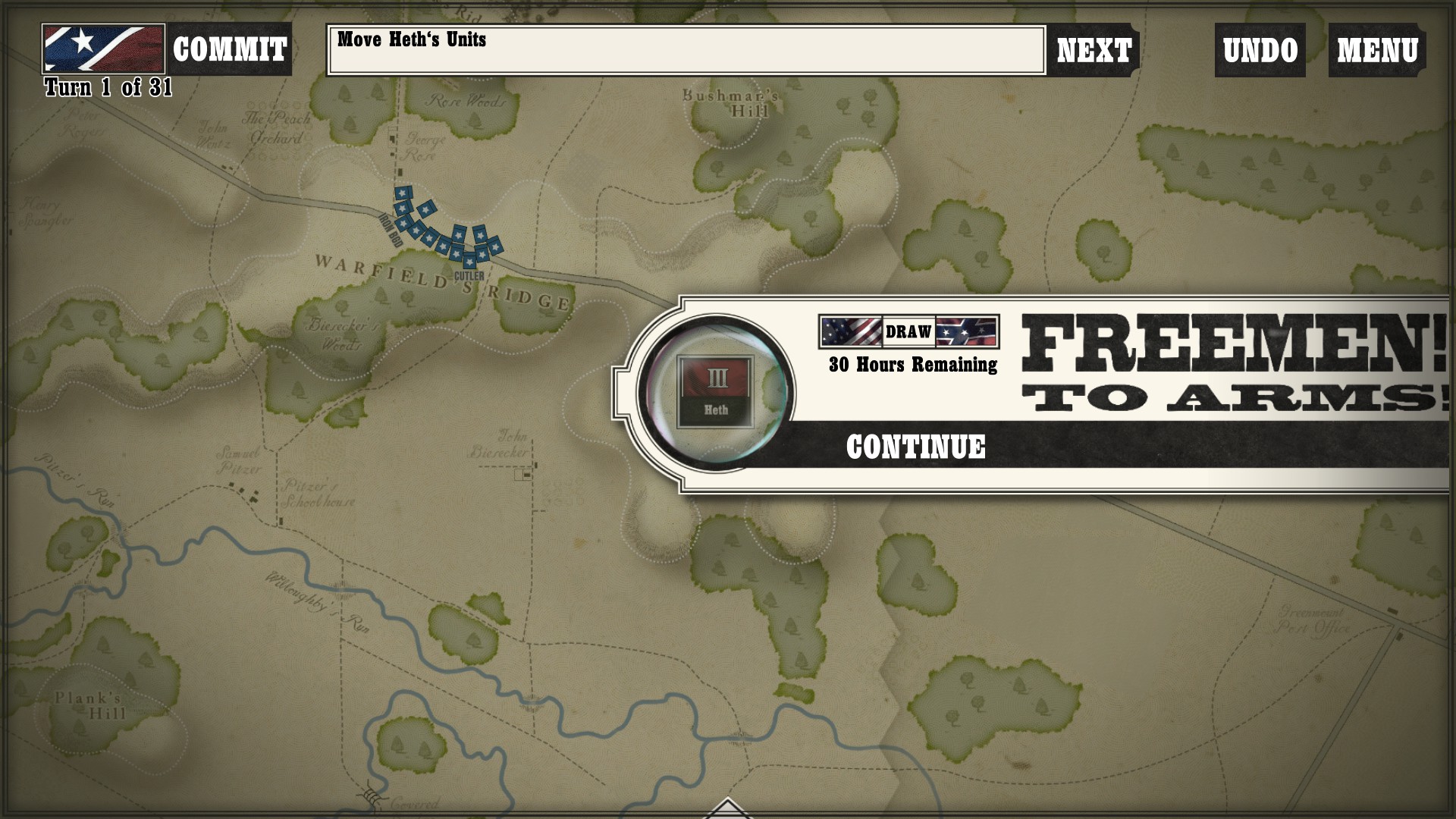 Gettysburg: the Tide Turns is easily a jump-in-and-play type of game. Every time I run across any kind of new game mechanic or information, a screen pops up to tell me what is going on. After I played my first campaign about halfway through as the South, I started a new one as the North to see if I would still get the same information screens. Three turns in, the only new information I got was about my horse artillery, which was new to me as I had not seen it while playing as the South (as far as I went in anyway).
