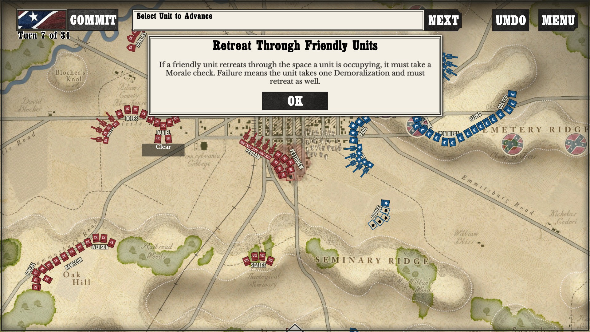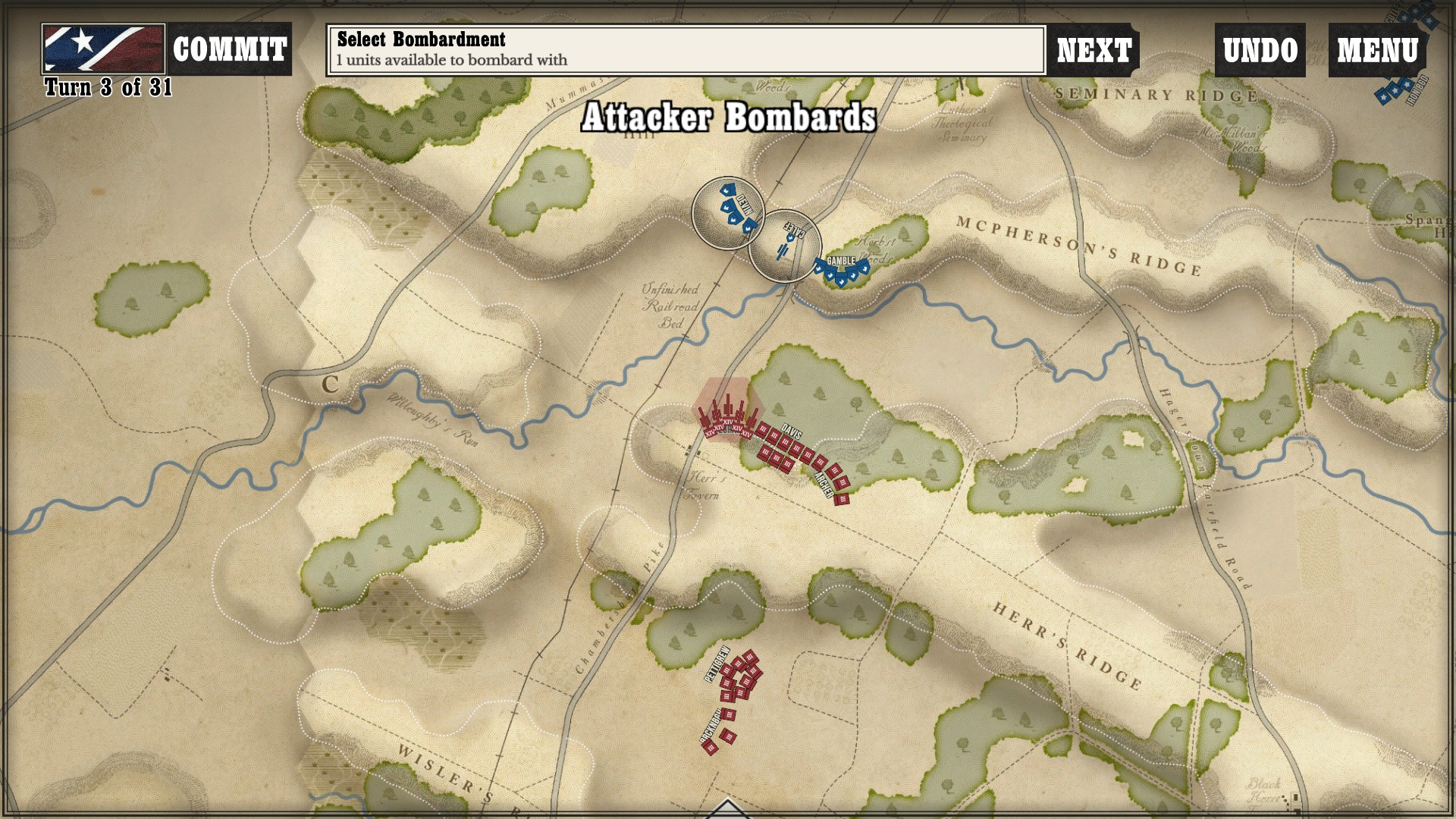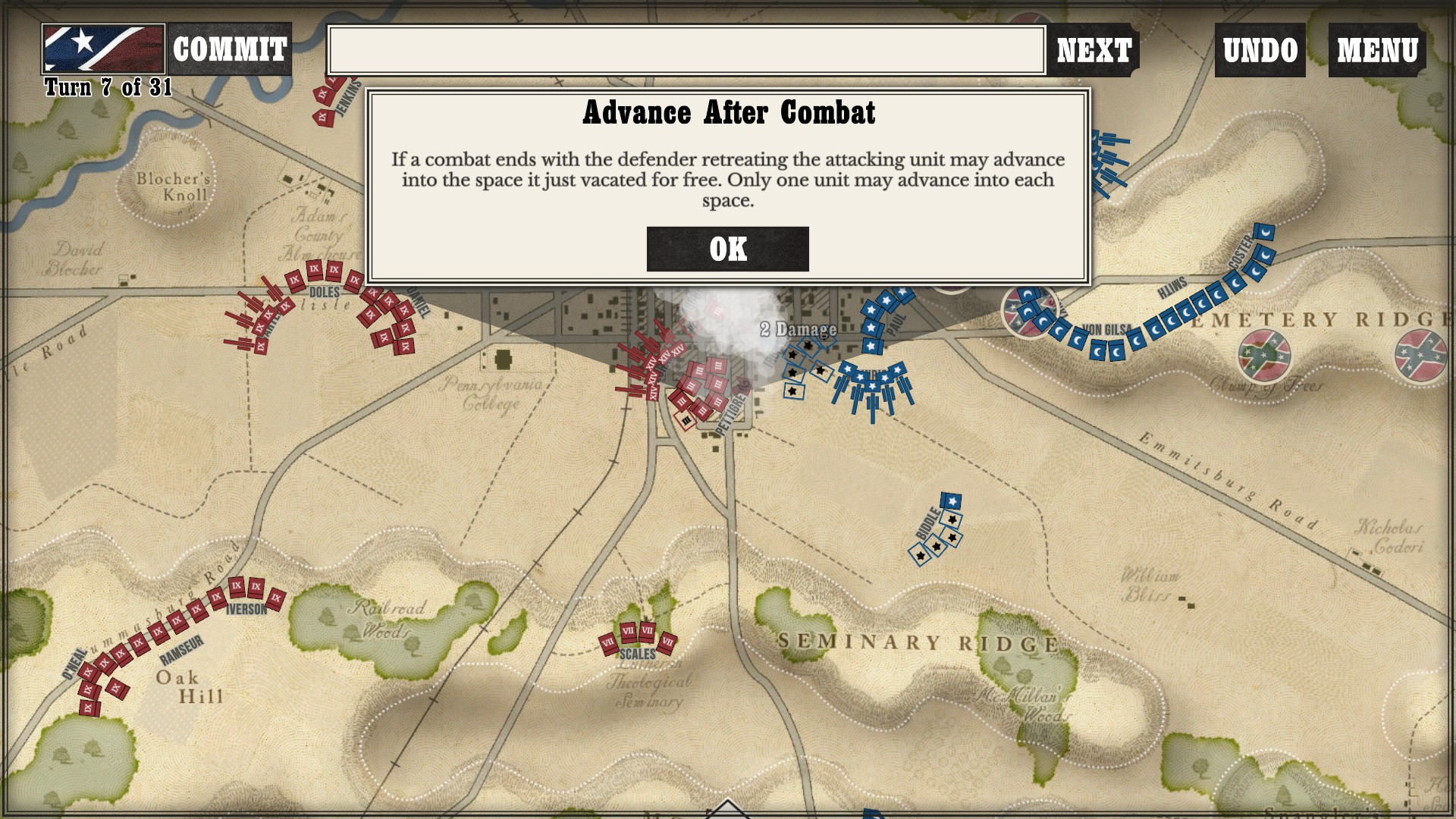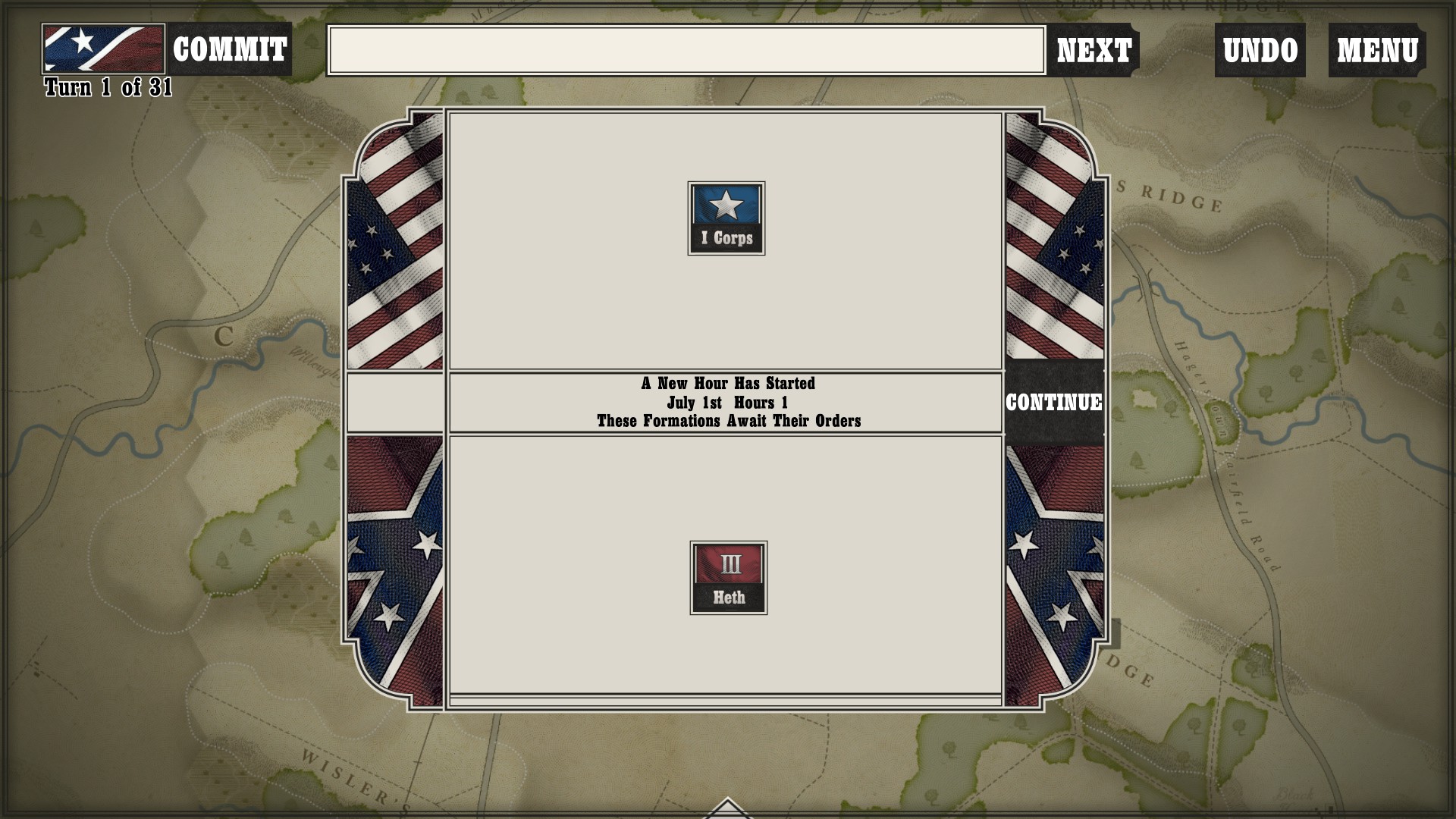Gettysburg: the Tide Turns is easily a jump-in-and-play type of game. Every time I run across any kind of new game mechanic or information, a screen pops up to tell me what is going on. After I played my first campaign about halfway through as the South, I started a new one as the North to see if I would still get the same information screens. Three turns in, the only new information I got was about my horse artillery, which was new to me as I had not seen it while playing as the South (as far as I went in anyway).