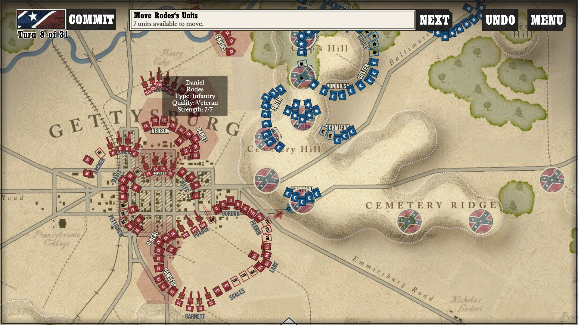 Gettysburg: the Tide Turns may be simplistic graphically, but there is quite a bit going on under the hood. After a few very minor bugs at release, Shenandoah and Slitherine seem to have gotten everything ironed out. Not long after it became available, they had already set up a tournament! While I may not be ready for that just yet, it is good to know that it is already to that level of competitiveness. I never experienced any crashes or turn freezes. The first thing that I have to do (as the South) is go back and see if I can claim the rest of the victory points from the hill. Then, I will turn my attention to my U.S. game and see if I can keep the Rebels at bay.