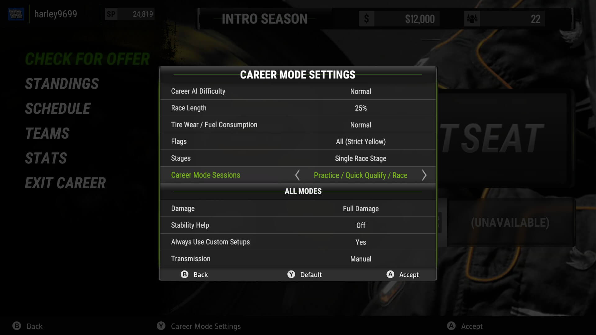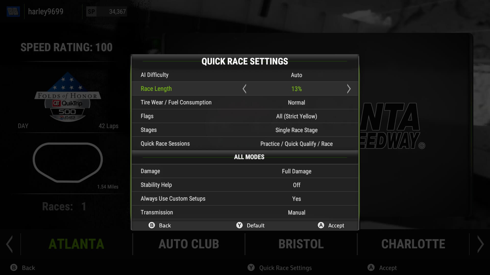 Below the Quick Race Settings are the Mode settings. The Damage options are None, Light, and Full. [Yet another reason I prefer Stock Cars over open-wheel racers. Sorry F1 fans, but I love the ability to trade paint and not have a flimsy, mandatory-change-needing, front spoiler or bent push-rod suspension bar rule me out for the rest of a 500-mile confrontation].