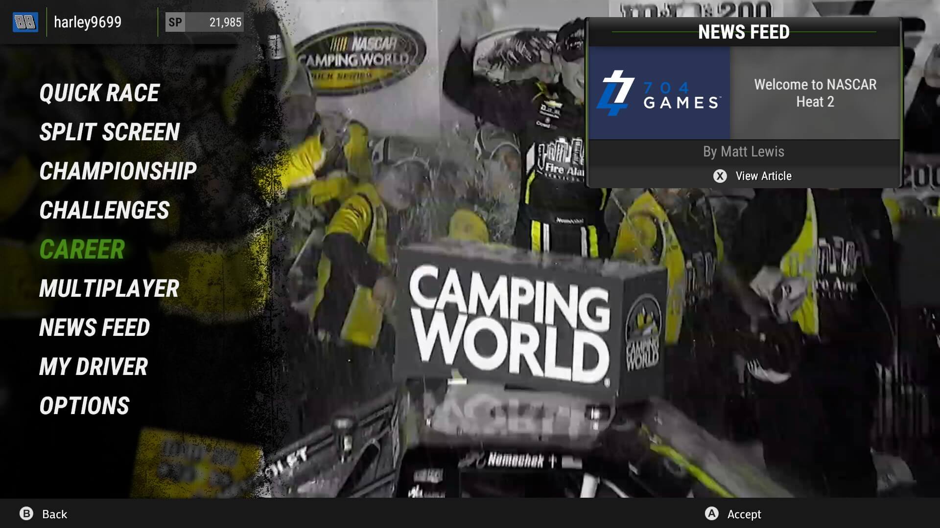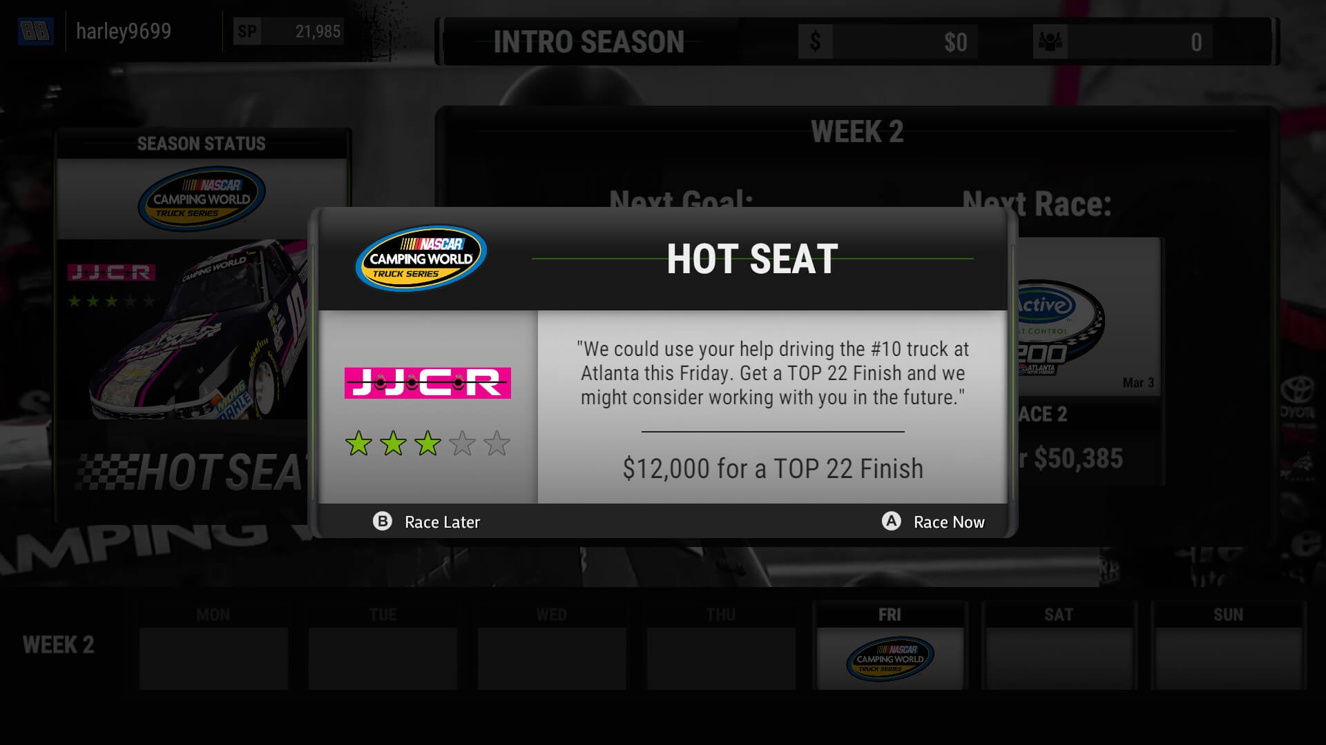 Another huge positive (for some people) is that you can start in the Monster Energy or XFINITY championship series if you choose to do so. As I previously noted, you can have all three championships going at the same time. However, if you really want the NASCAR experience, from being a local racing icon to running with the big boys, Career mode is the one to decide on. For me, this is the meat-and-potatoes of NASCAR Heat 2. You are starting at the bottom and in the Camping World Truck Series. As the weeks go by, you may or may not get a hotseat ride offer for that week. Once you do, you will only get paid if you perform to their expectations (e.g. a Top-22 finish or better). Then, you will have to wait until the next offer comes by. (note: the weeks go by very quickly if you do not get to drive on a particular day) Remember, you are an untested, ultra-green rookie. These car owners are not going to be putting you behind the wheel of extremely high-priced machines until 1) you can prove that you are worthy to drive for them and 2) that you are not going to go out and tear up their expensive trucks. With some time and experience, you will then start to get job offers to actually join teams. To say anything more might be too spoilery. Needless to say though, you will have to work your way up and through the ranks before you can drive at Homestead-Miami in the Monster Energy series’ finale.