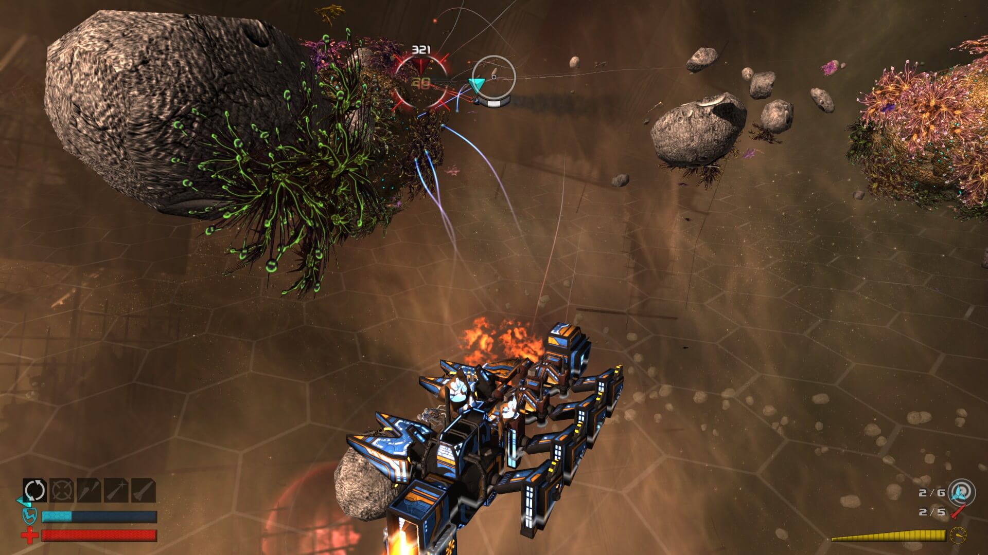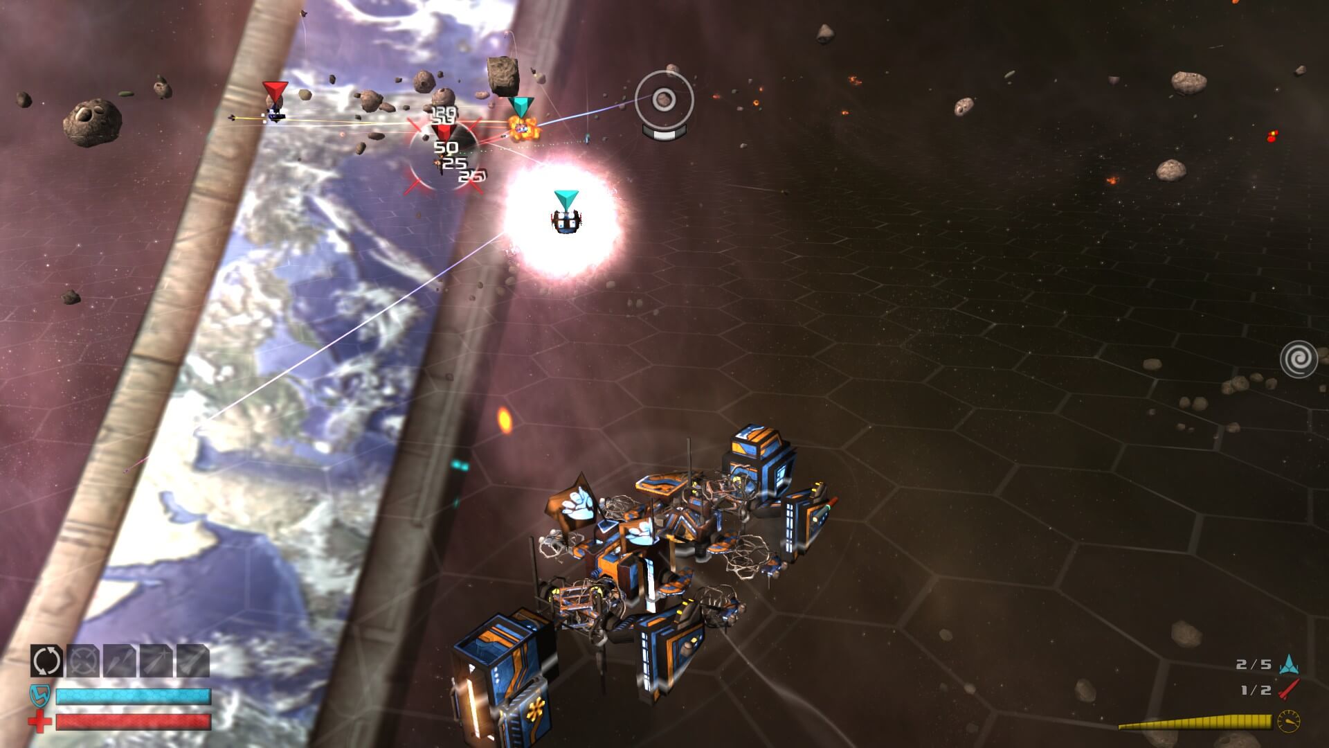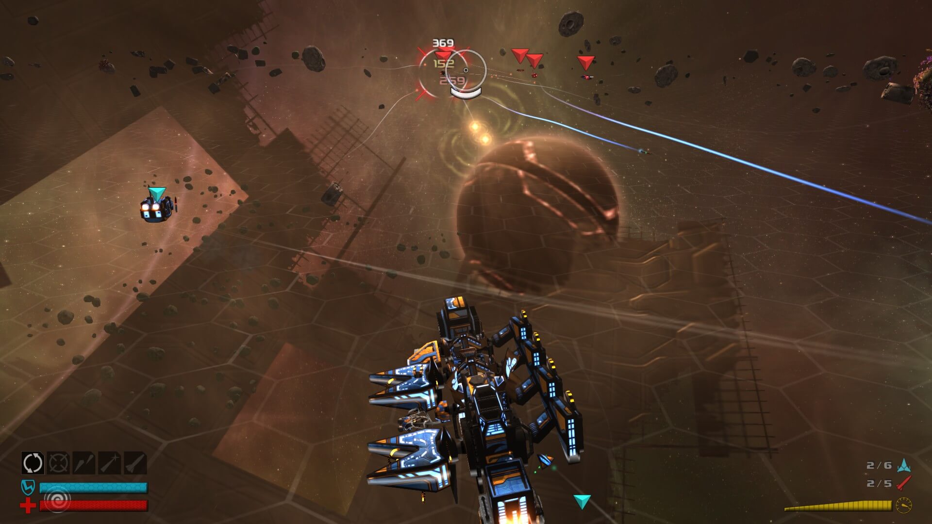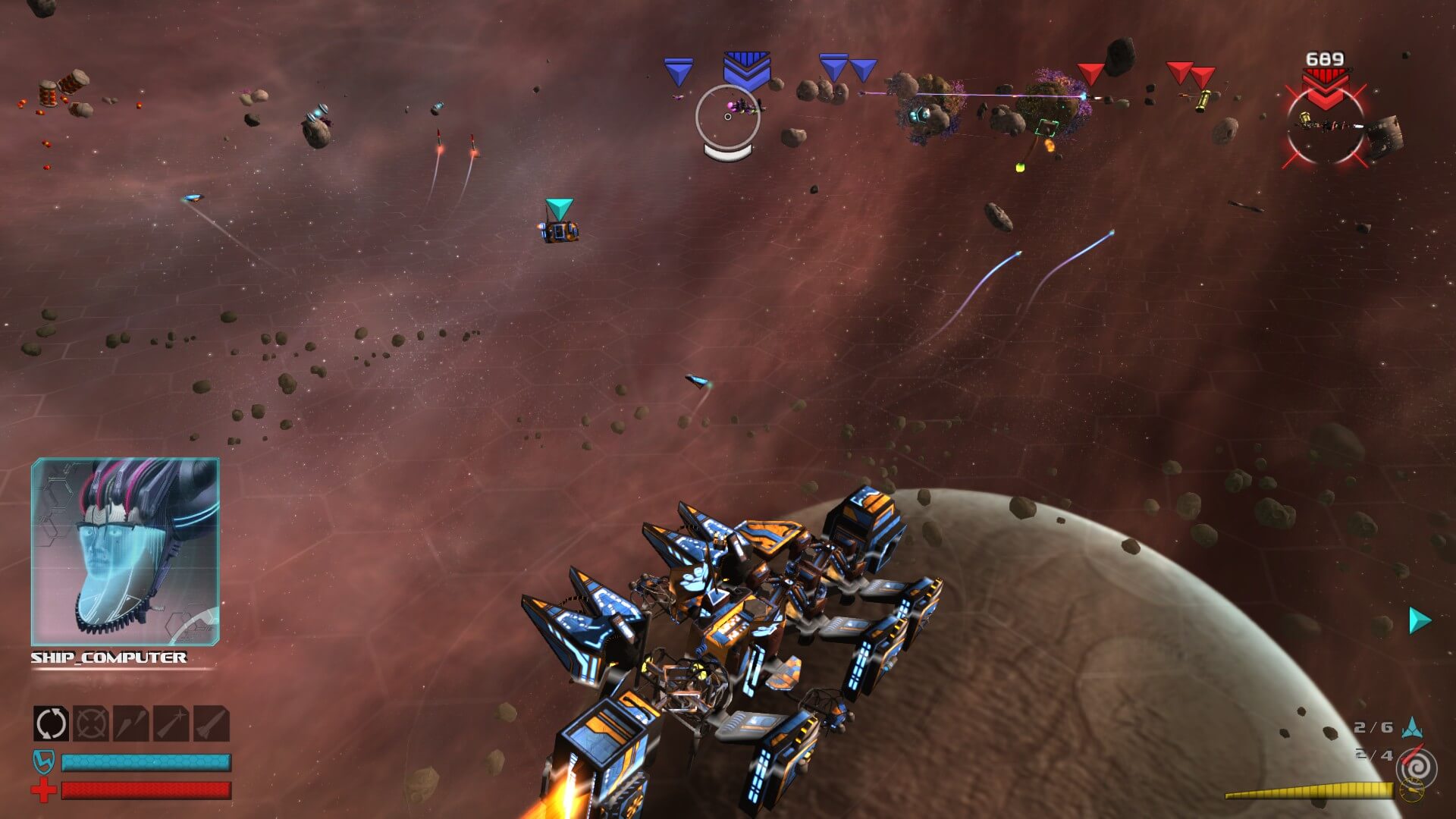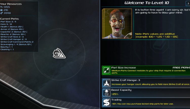 As you fight your various foes, parts sometimes come right off of their ships in the middle of battle (be careful, because yours might do the exact same thing), and since you are equipped with a tractor beam, you can deconstruct and reconstruct your ship mid-combat. If you see a part that is superior to one of your own, it is relatively easy to swap them out, literally on the fly. If you are lucky, while you are shoving missiles up your opponent’s aft (one of Commander Elsa’s favorite sayings), parts might just fly off for your perusal. Currently out of juice while your omni-lithium capacitor is being swapped out? Just ram your enemies. T-bone them. Stick your nose in their aft. Yeah, just run into them and see if you can get their pieces to pop off.
