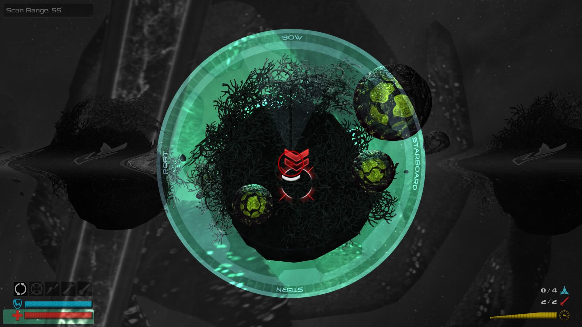 How do you buy all these components, other than selling or trading older ones? There are three main tradable items in SPAZ 2: Scrap, Rez and Goons. Scrap is, well, scrap — akin to scrap metal. Rez is the mysterious “transmutable element” which powers every ship (there’s also that tiny thing about it holding all of the secrets of the universe [no spoilers!]). The faster you push your ship the more Rez you burn through. Goons are people who are used to repair ships, but more so, they are a trade commodity — almost-worthless humans. You do need them to man your ship as well, though. If you have too many Goons on board, however, you once again burn through your Rez quicker. Final note: carrying extra weapons or parts burns up more Rez too. A lot of the fun comes from this delicate balancing act.
