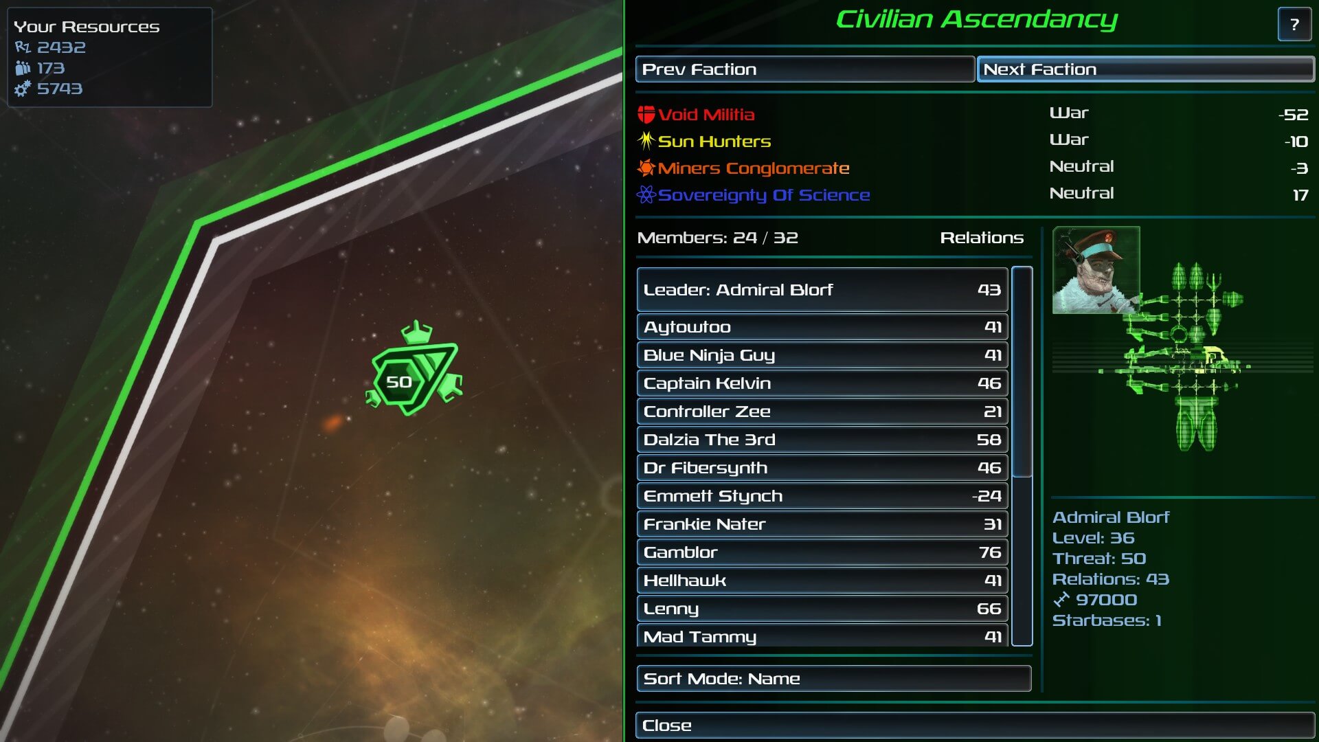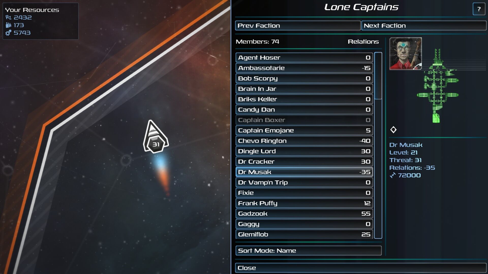 SPAZ 2 has two hundred individual captains. At the start, some are already aligned with a faction, while a good portion is not. You have a ‘current standing’ with each captain. Unfortunately, you start with some of them already disliking you — whether they are in a faction or are simply free traders. All of your actions, throughout the entire game, are remembered by everyone. So, each action you take has a positive or negative effect on the universe, as well as each personality. You might want to be careful to not be too laser-emitter-heavy too soon. Relationship balancing is just as fun as your cargo maintenance.