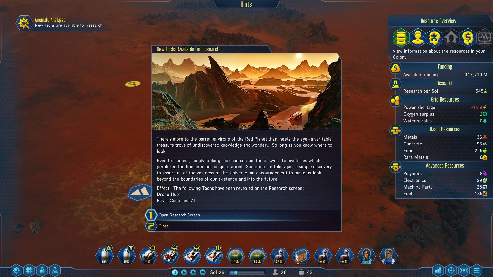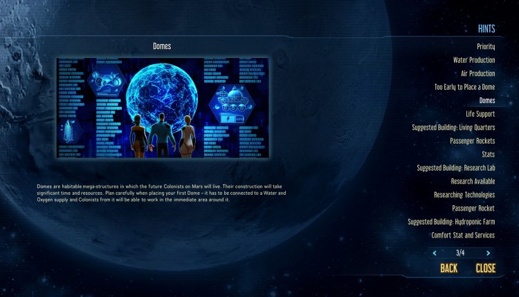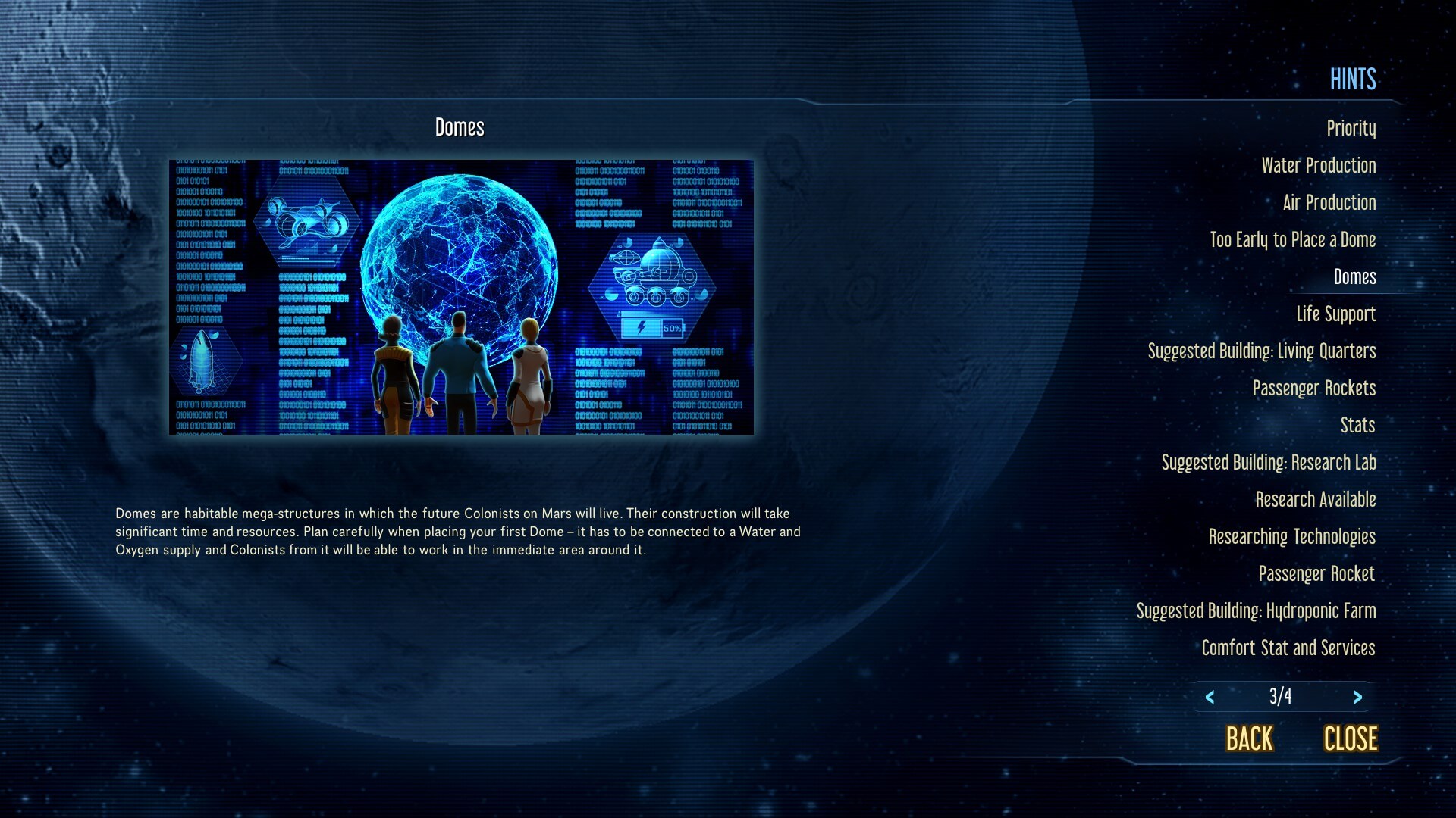 As a guy who got used to reading printed manuals during my 138 years of PC gaming, I actually read through all the hints before I began Surviving Mars. In retrospect, that was all quite unnecessary. One can easily fire up the game and go. The hints pop up whenever needed. If you try to build a dome too early, for example, Surviving Mars will literally tell you that you’re not ready — as well as tell you why it’s not time yet.