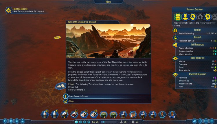 Along with concentrating on all of this building, preparation and spending, you should be researching different technologies to help you gain an upper hand in Surviving Mars. In addition to each playthrough being randomly generated, the tech tree is as well. Just because you may have finally found a formula for research that worked well ‘last time’, don’t expect the technology to be in the same place or sequence now — because it won’t be.