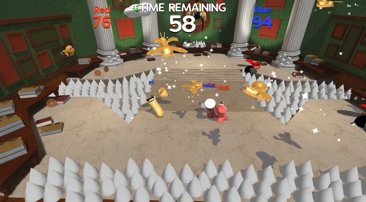 Sumo is simply set up with a lives system — kill or be killed — and you start with four lives each (eight on a two-person team). Knock your opponents (or perhaps your teammates) into the spikes or other environmental traps; the game gets so frantic, its difficult to tell who is who. This frustrated me a lot, especially when I felt like I had no control over who was doing what (including my own character), as you get bumped a lot in this game.