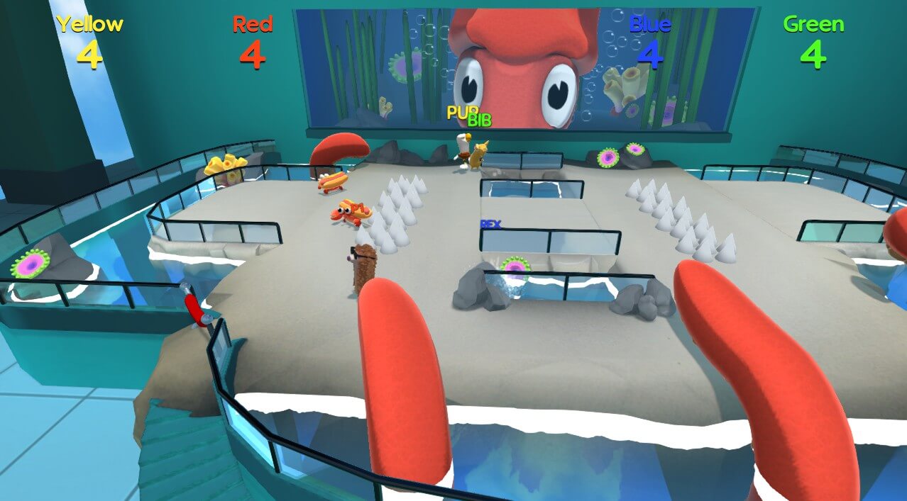 The first thing I noticed was the attention to detail on the characters. We had the ability to pick out of a selection of many different cute animals, and we could pick our “costume” as well: I selected a hedgehog with a football helmet. Once things were in order, the museum level loaded and we were playing this wacky game. The controls were relatively simple: standard movement with the left stick, jump and ground pound (same button), dash (propelled with a fart from your animal of choosing), and with the right stick we could swing our long necks/heads around and smack other players or objects with it – such as the soccer ball.
