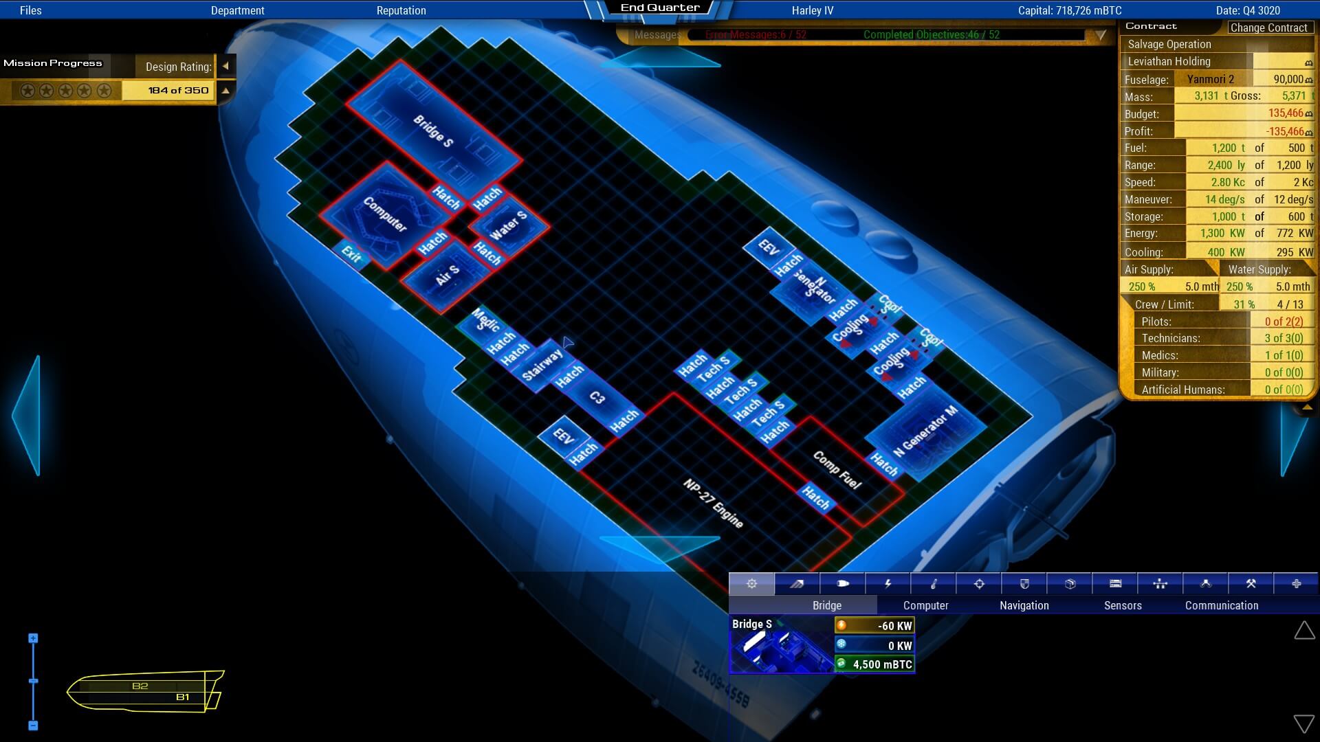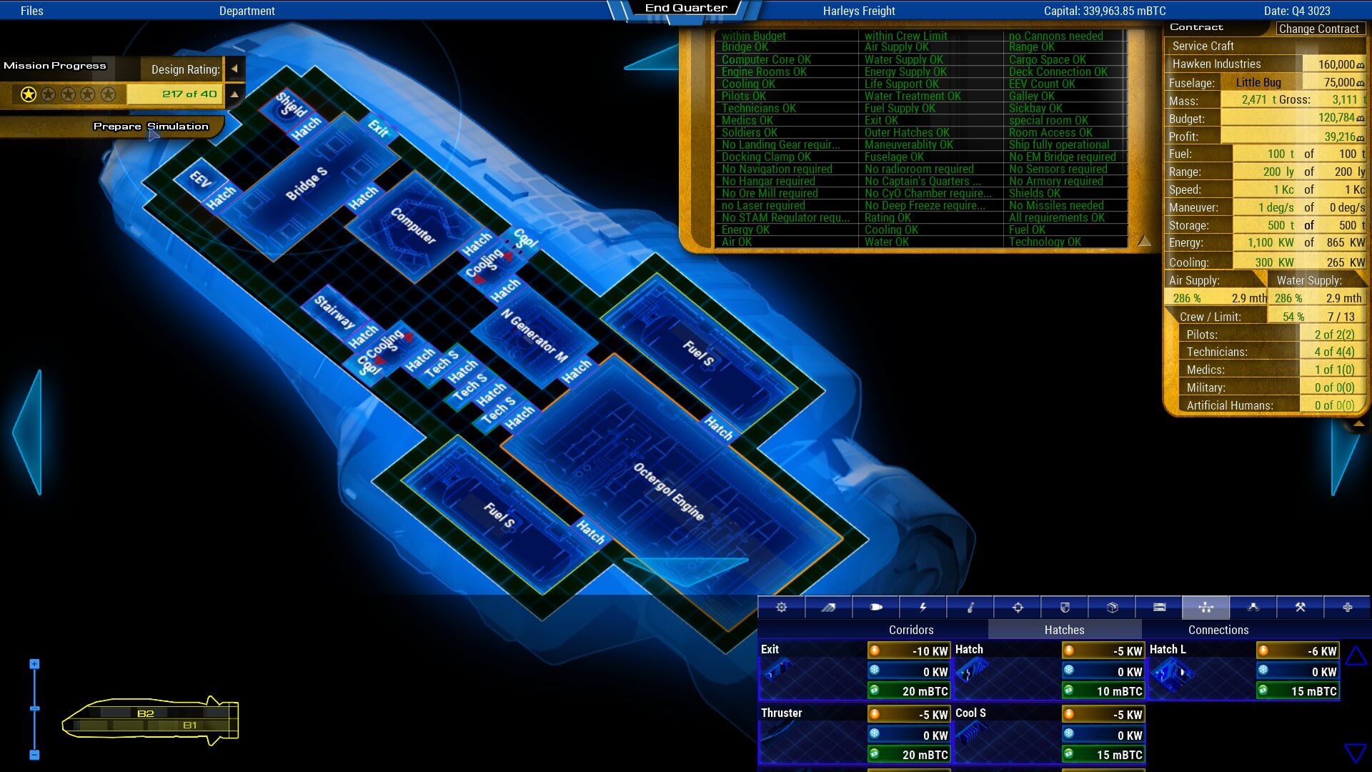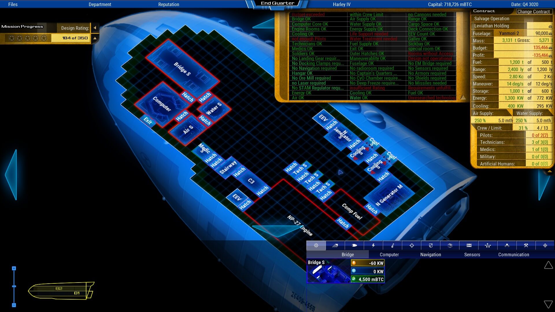 This is a game that is immensely complex and complicated. You’d better eat your Space Wheaties and drink plenty of Tang before attempting to control a company of both this magnitude and intricacy (AKA delicacy). You start your career based on Mars with only a few initial contracts. These involve, as most do, creating ships that don’t exist and are needed for (usually) a specific task. Alongside a list of customer requirements for the ship, certain items are needed for every ship to function. More on that in a bit.