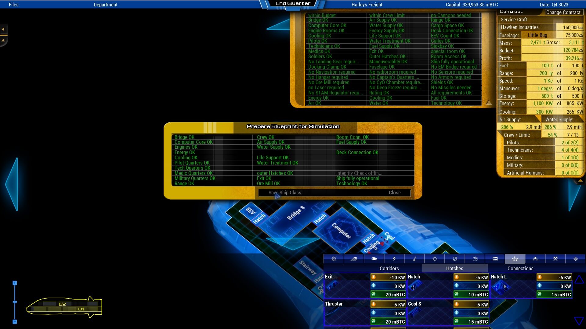 You have all of the requirements ‘green’ on your progress screen, but then you have to run the ship through ‘Prepare Simulation’. The simulation runs in order to make sure everything is ship-shape and working together as planned. When your new creation passes, you can save it as an actual, functioning vessel class.