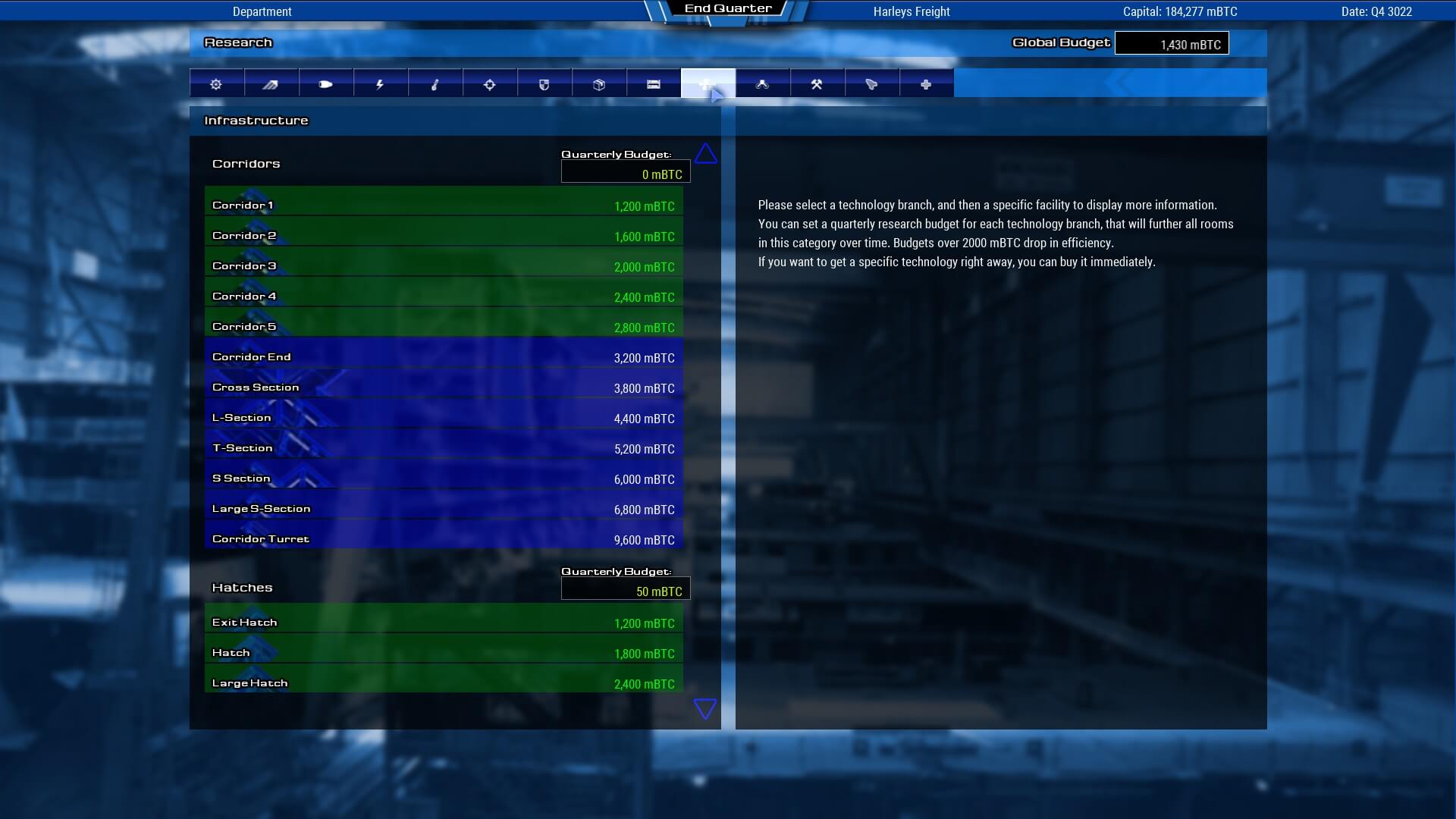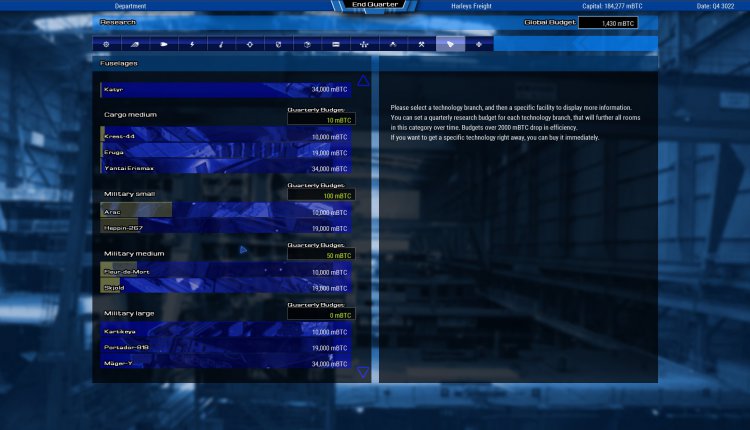 A lot of times, the new ship you’re designing needs a part you haven’t researched yet. You then have two options: wait on this particular contract until the component is researched or spend some extra money and instantly buy out that part of the research. In the beginning at least, it’s easiest just to buy the piece to get the ship built.