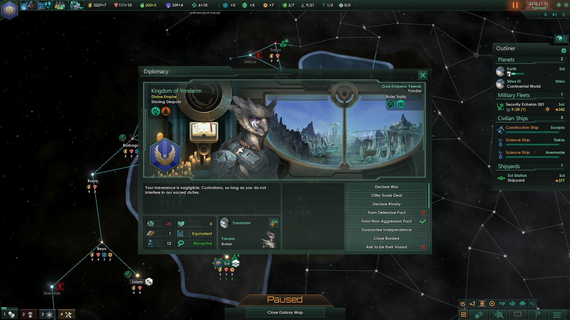 We were just building and surveying along when — excessively early — we met our first neighbors: the Kingdom of Yondarium. They’re a bunch of bird-headed, Authoritarian, Fanatic Spiritualist, Slaving Despots that prey on the feeble and fragile — all in order to keep increasing their slave population. They use their military power to exploit anyone they deem pathetic enough to overrun. *Makes dry-spitting sounds: ptoo, ptoo*