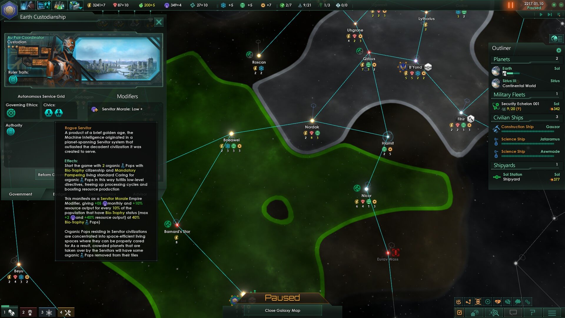 As a civilization, we were a Machine Intelligence while being Rogue Servitors, meaning we prefer Continental (Earth) planets and are Efficient Processors and Emotion Emulators, but our downside is that we’re Bulky. Our other civic was Delegated Functions and, because we’re machines, we have a Gestalt Consciousness.