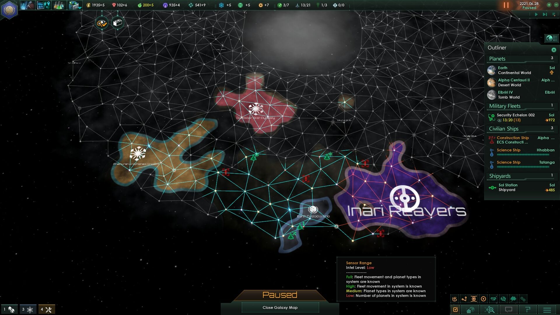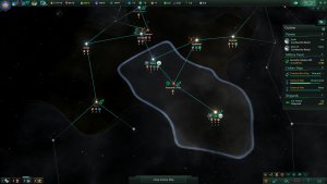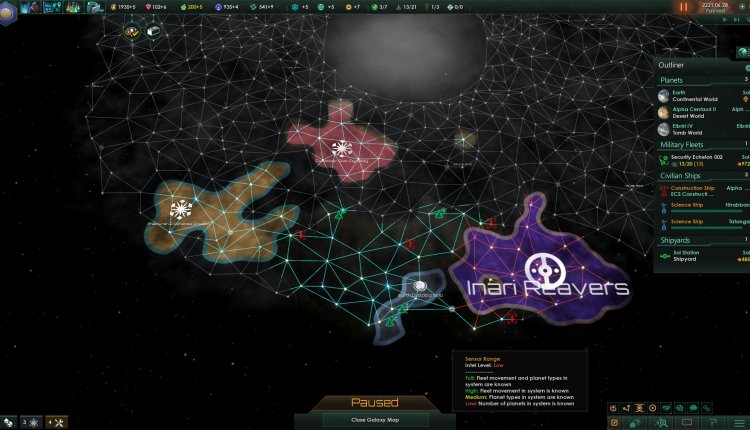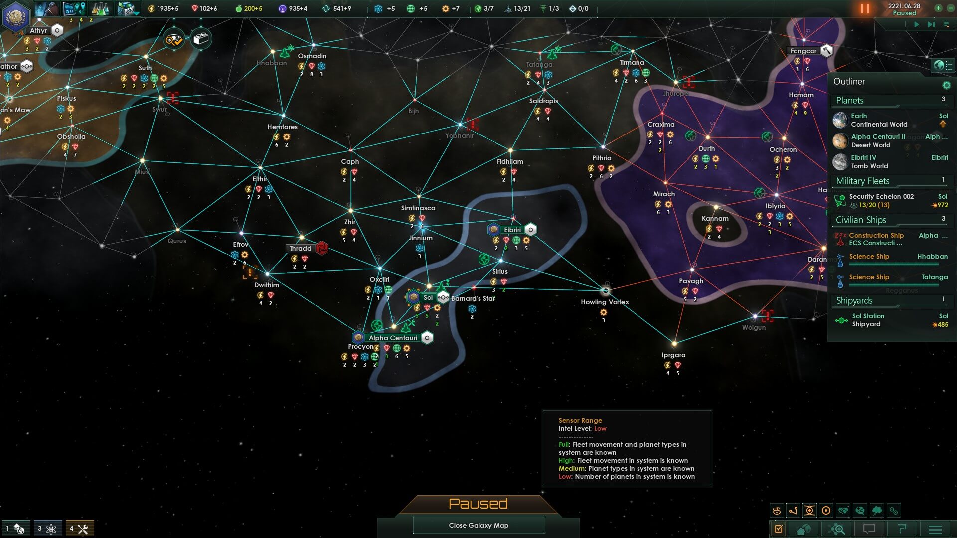 You see, we found the above planet: Nicor. It’s a level twenty-five alpine world. We machine salivated. *Tink, tink… from the little, extra metal pieces from our mouths hitting… well, nevermind* We really wanted to colonize this world. Our problems were three-fold. First, we didn’t have direct access to it via our own hyperlanes. Second, we were already using Yondarium space to fly our survey ships through. At -25, it’s not like we were their favorite machines in the galaxy anyway. A slip or mishap, anything to anger them, would cut us off from an L25 world. Finally, since we’d already tried to go south of Nicor, we already knew that an enemy, 906 strong, was sitting in Eurav Wass, right next door. Our fleet was still only 342-strong.