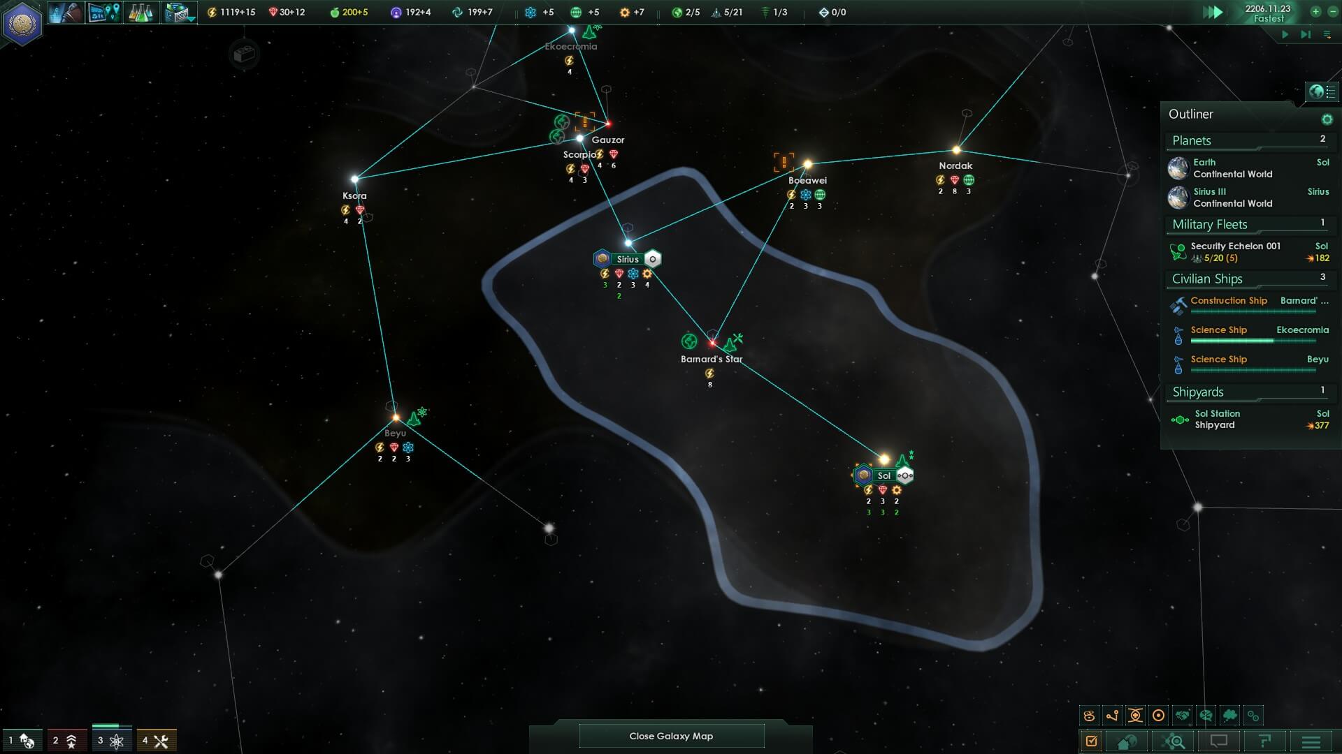 The most logical and sensible way to go was to keep developing west as much as possible, then deal with the Avianboys later. We were machines, after all. Any other choice would be stupid and illogical. It’s too bad our leader was a gambler and really wanted Nicor. We sent a construction ship, then a colony ship to Nicor as fast as we could build the latter. Is our leader brilliant or a gambling idiot?