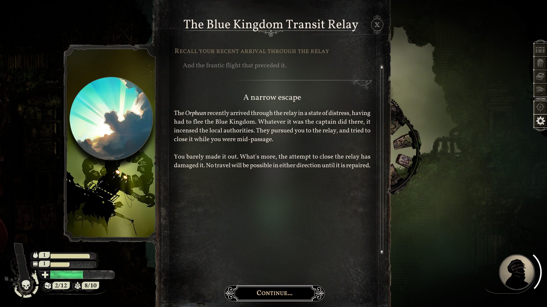 The last real commodity is supplies to fix the damages acquired on the ship. Sunless Skies has, what I call, a multi-layered background. This certainly adds beauty to the game, but it can also become confusing as to which layer you are actually cruising on. There have been times I thought I could just drive through something, only to find out it was solid. Conversely, there were times I’d avoid a certain landmark believing I would crash into it — only to realize later that I could have been sailing through it the whole time. Between self-induced harm and fighting enemy ships and/or monstrosities, your ship will get damaged. If broken down to the zero mark, you’ll sink and, of course as per usual, die.