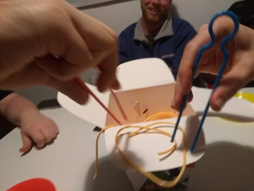 Even with a big bunch of adults, we had a really good time with The Noodle Game. We are competitive, making it far more serious than what you’d end up playing with kids, but the physicality of the chopsticks and the wait to get noodles out of the box provides for a very nice game to play.