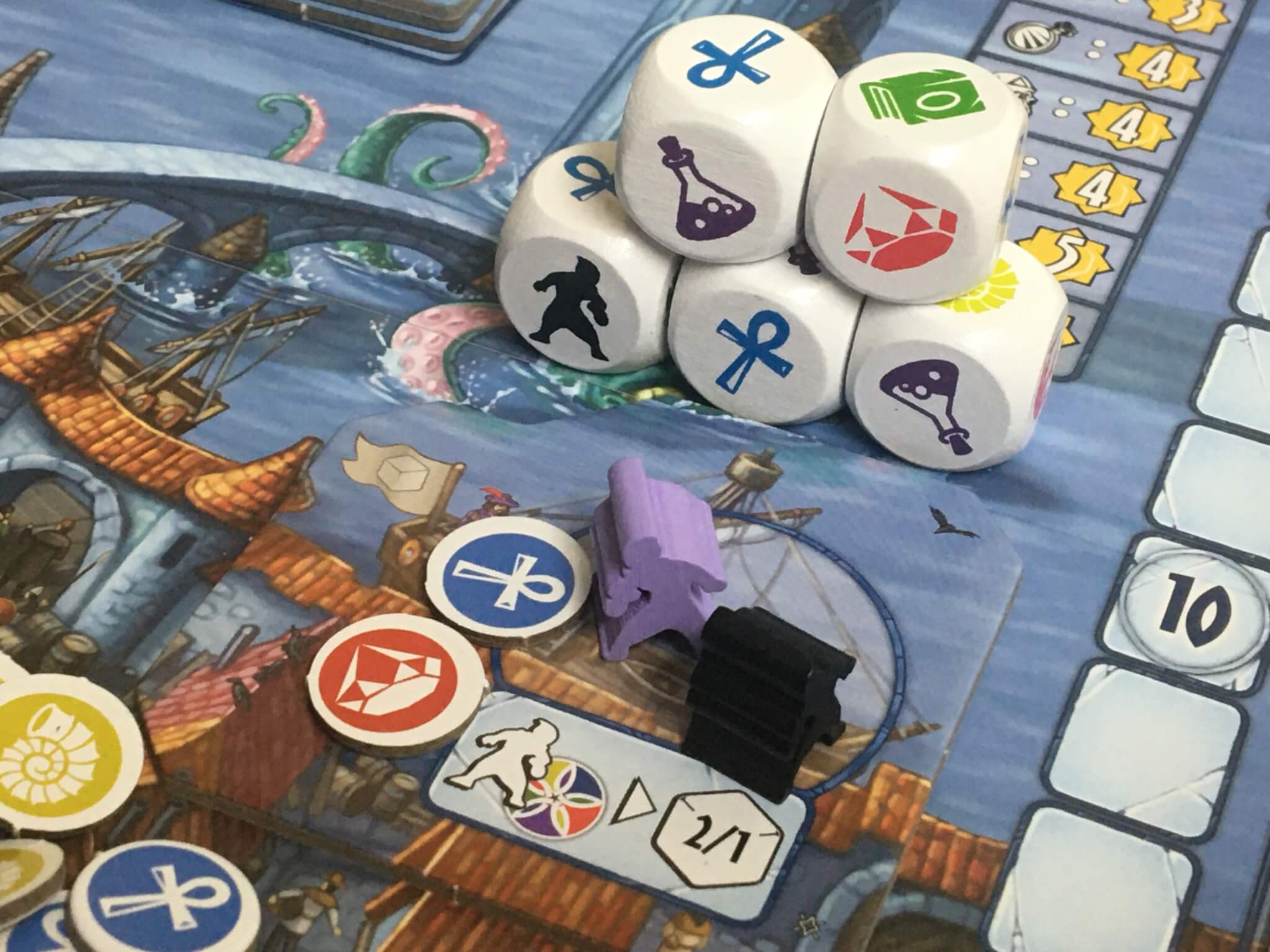 One addition to the game that was not available to us during the preview is the ‘Fortune Favors the Bold’ expansion, which contains a number of new features. There are several new components that each add to a different area of the board, but most of them are built in one way or another around the central idea of being able to roll a dice to gamble on the outcome (hence the name.)