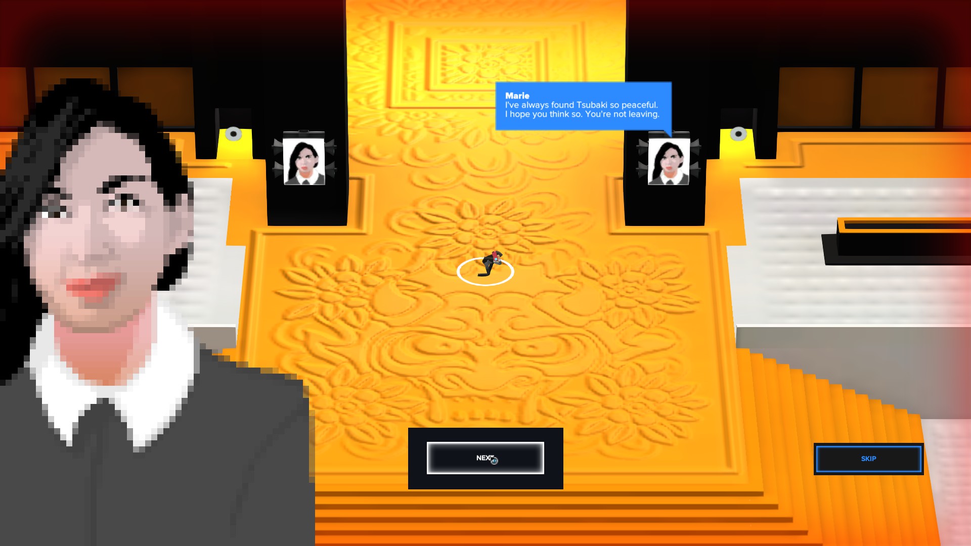 The isometric viewpoint of the game lends itself well to Tokyo 42’s rooftops, better yet a handy indicator is anchored to you when you leap, which does a great job of ensuring that the only reason you’re going to miss a jump is due to a failure to correctly gauge a distance. That said, that will probably happen a lot – the game’s camera system pivots between 8 directions in single step-movements at the players request. It’s an interesting decision, and with many of the buildings designed and shaped to match those axes the game’s slower, exploratory, and platforming moments channel classic perspective-puzzler Fex. One of the times when Tokyo & the camera system are at their best are when you’re ambling around windows and ledges as to collect cat designs, coats, weapon skins, or to open map shortcuts by finding hidden buttons.