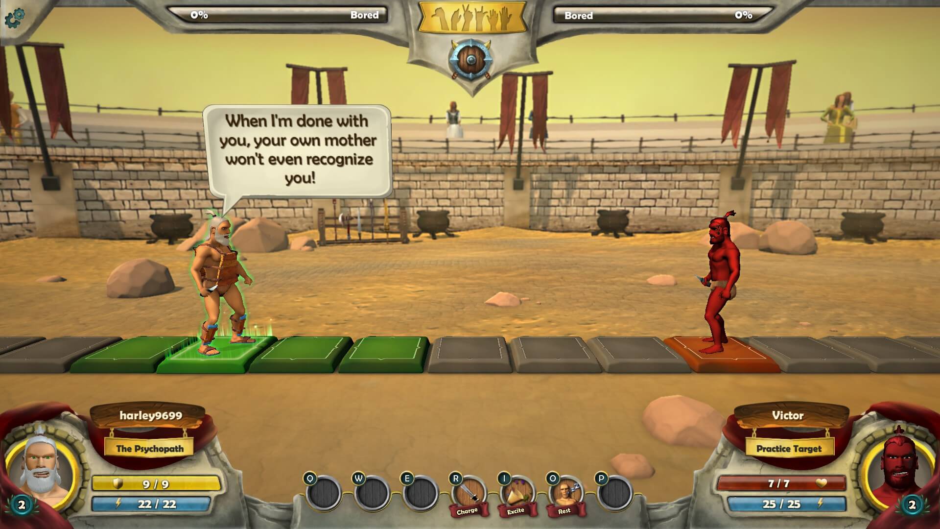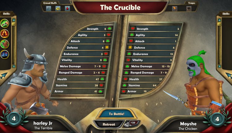 Provided you have enough stamina, most strikes generally have different levels. For instance, a melee swing can be light, medium or heavy, while ranged can be either normal or powered. Obviously, you want to do as much damage as possible with each attack. However, the more powerful the swing or shot, the more likely it is for your opponent to dodge it. So while a heavy swing with an axe each turn is appealing, you a) are burning more stamina and b) may be missing them altogether each time, inflicting no harm. You may be missing each time, while he is connecting, causing you the pain! As you wale on each other, the assaults slowly dwindle down your armor before affecting your health. Once the armor’s gone, you start to take the blows immediately to body (health points).
