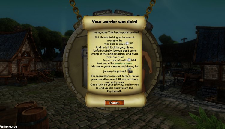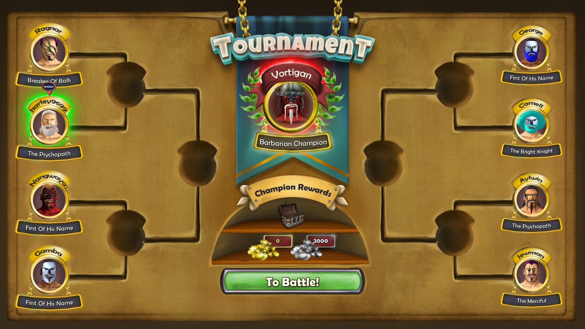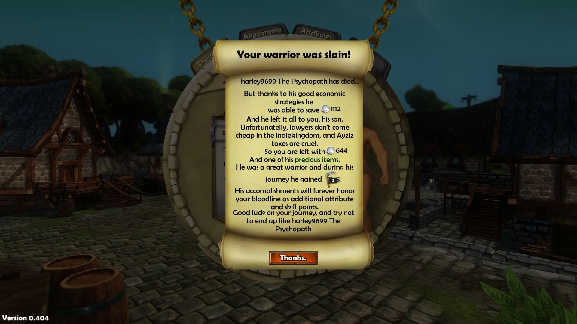 Between each duel, you can visit the shops and purchase any earned attributes and skills. And, after a certain number of duels, you go to the Tournament. These are elimination battles to try to get to the baddest of the bad: the Champion. Like any good tournament, these fights are one and done if you lose. Winning moves you forwards, losing moves you… deadwards. If/when you lose, your ‘heir’ starts from the beginning on your behalf — this is the result of my stupendous *cough, cough* first tournament: