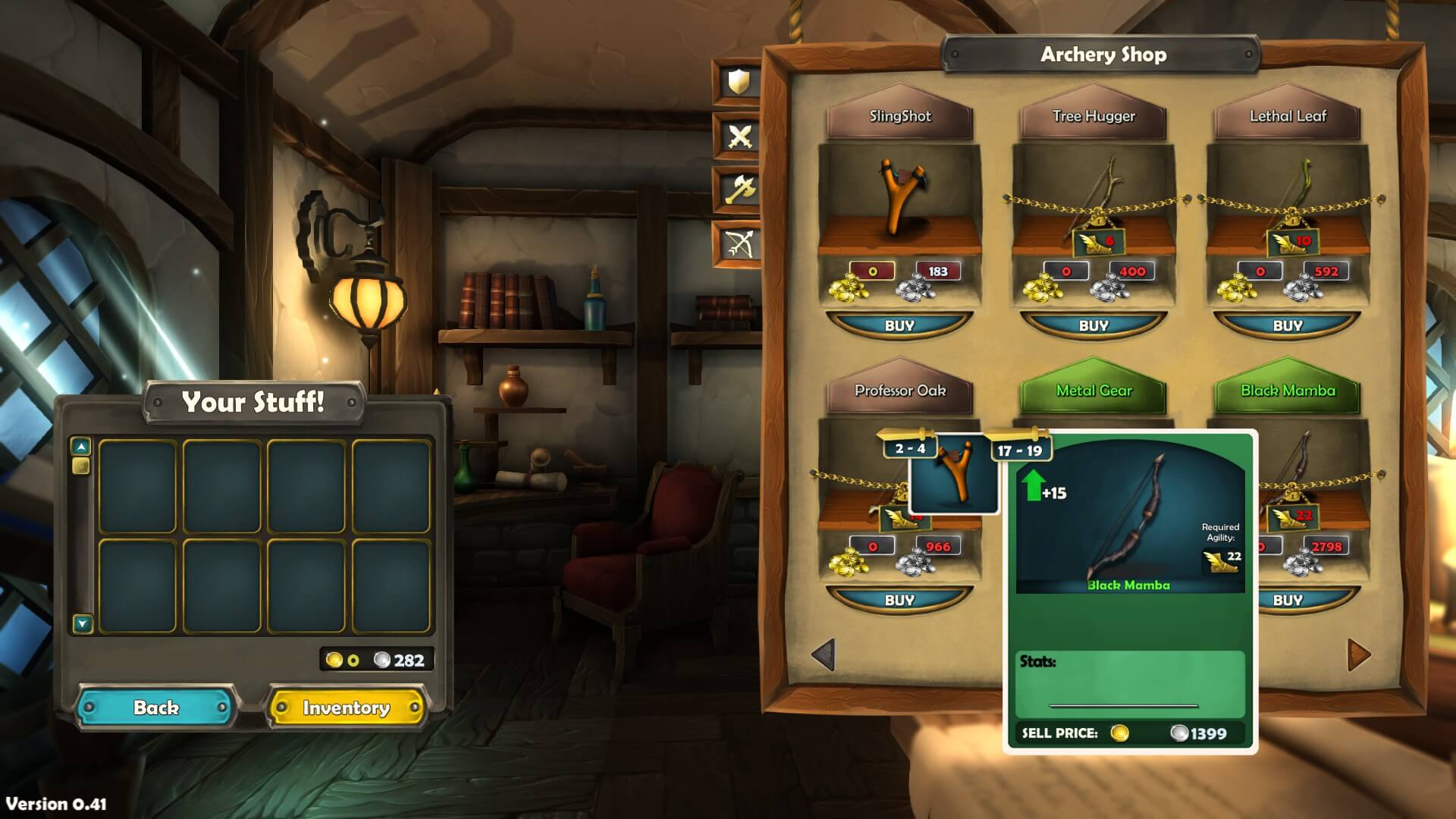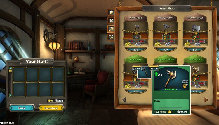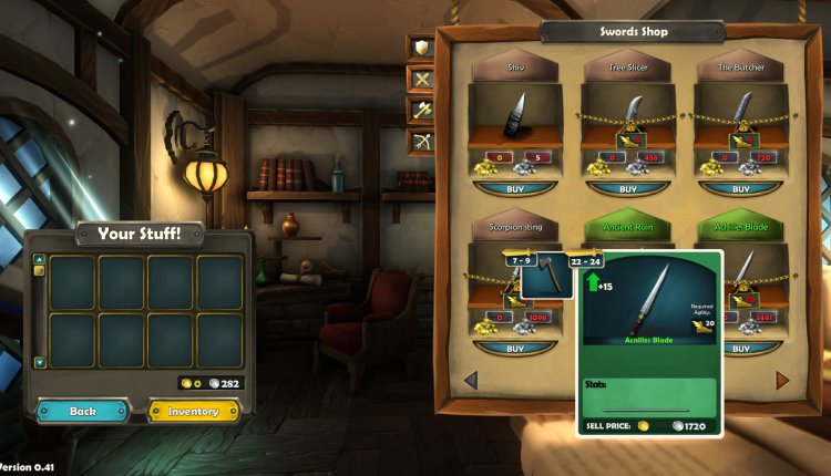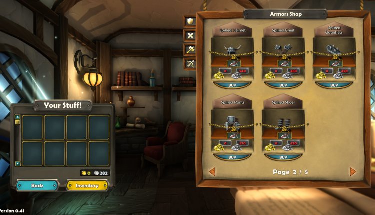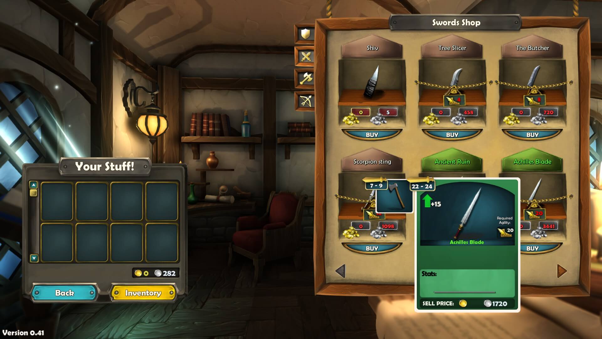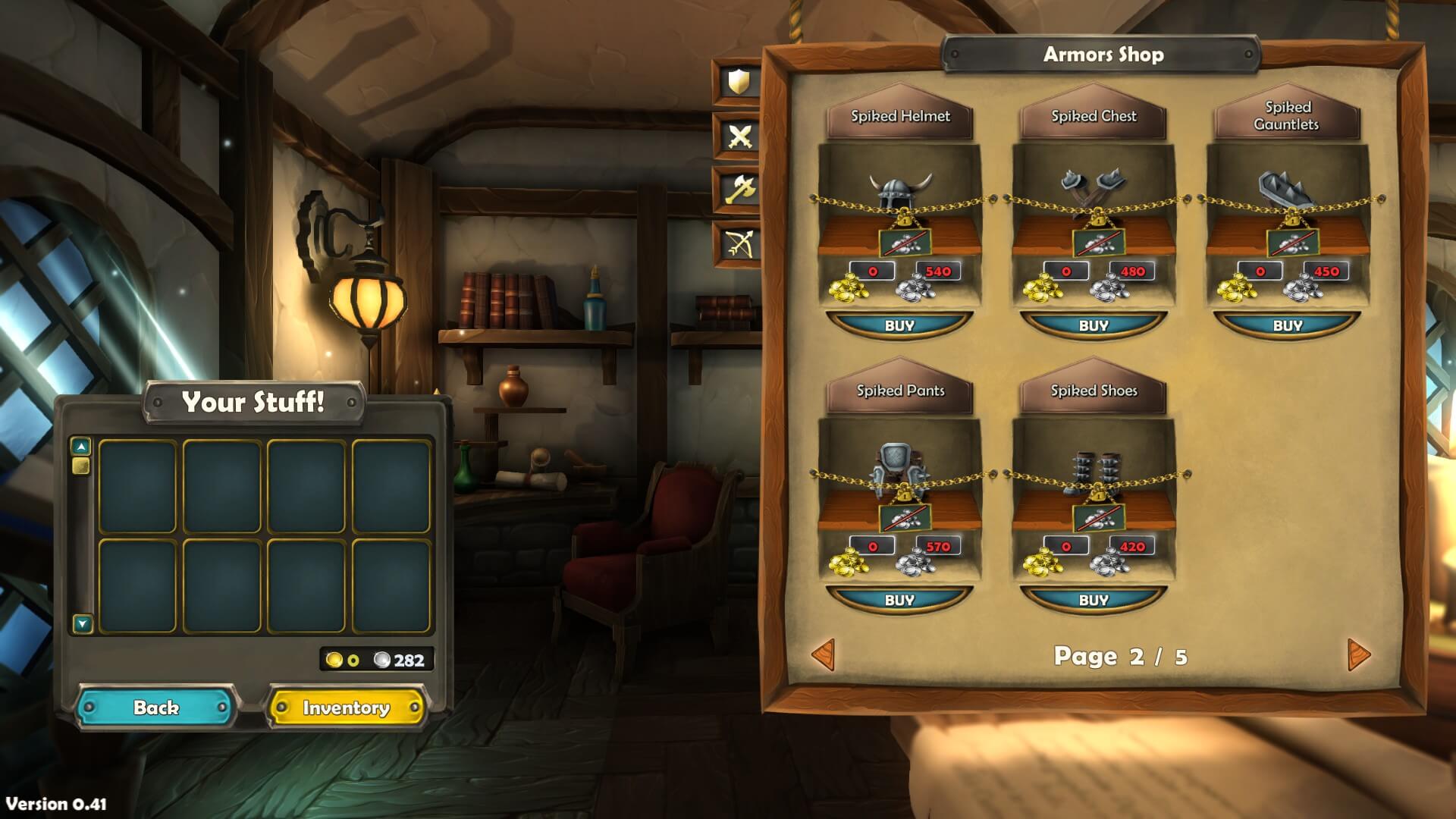 You start with barely a weapon and no armor. You are also broke. To earn money to buy weapons and armor, you have to go through a series of duels. Defeating each enemy earns coins, with the possibility of gaining soul shards. As per usual, weapons and armor become better the more money you throw at them. However, regardless of your financial situation, you also have to be a specific rank or have a particular level of strength or agility in order to buy high-level pieces. Weapons are swords, axes or ranged weapons; armor starts with a wooden series, then steps up to spiked, and can be equipped on your head, hands, torso, etc.