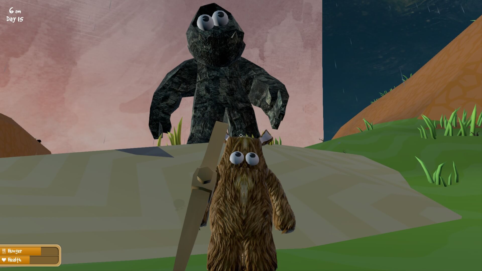 If you can get a complete shelter built, I understand it’ll withstand tornadoes. Yes, there are tornadoes, but I’m trying my hardest not to spoil all of the strangeness that occurs in Wrongworld. Since I haven’t made it that far yet, I haven’t been able to test that theory. By using stone, it doesn’t really take too long to build a basic building… if you can be left alone long enough to actually put it together.
